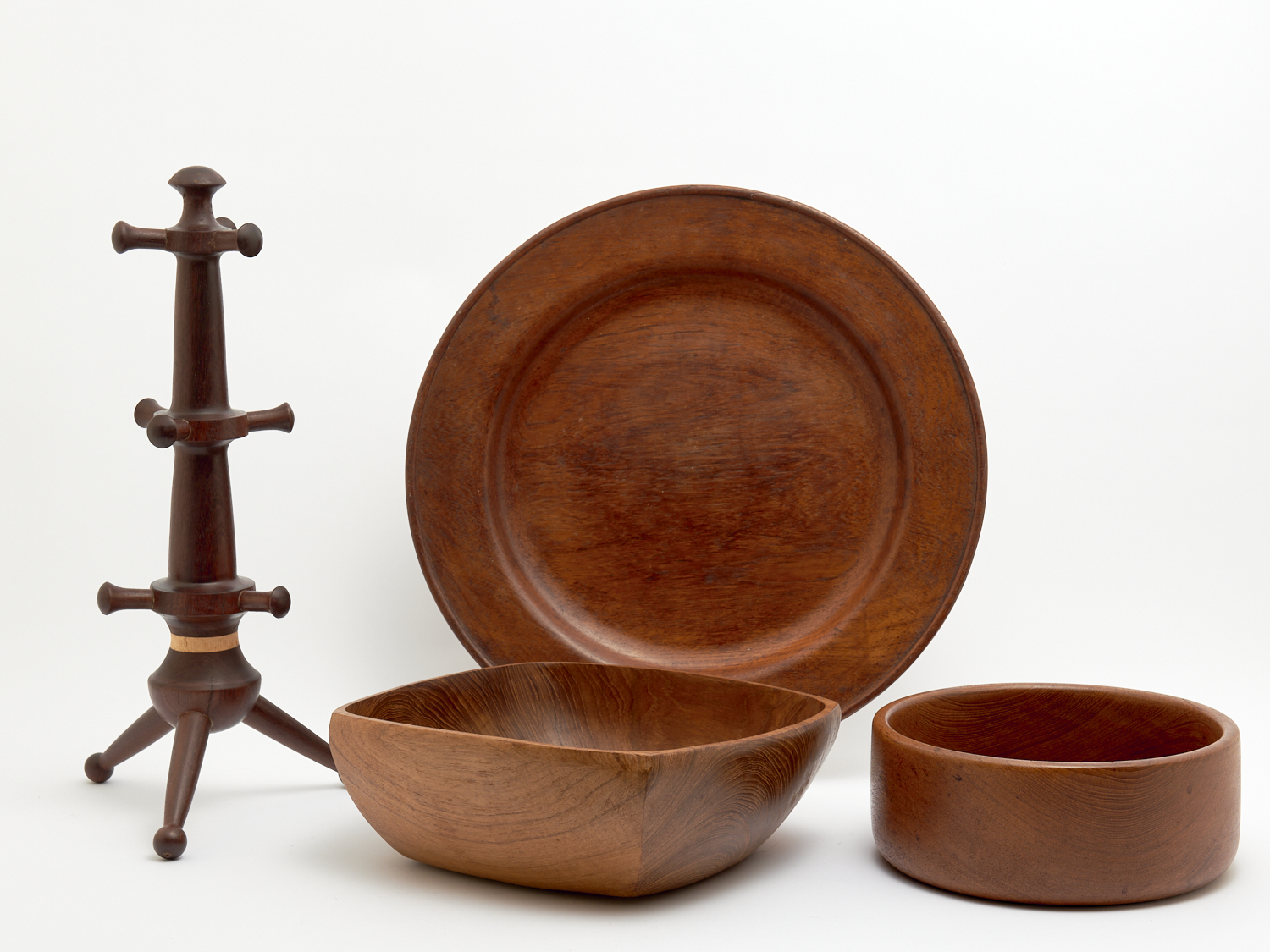 FOUR DANISH TEAK AND HARDWOOD PLATTER BOWLS AND STAND DIA.44CM (LARGEST), LEONARD JOEL LOCAL DELIVERY: MEDIUM