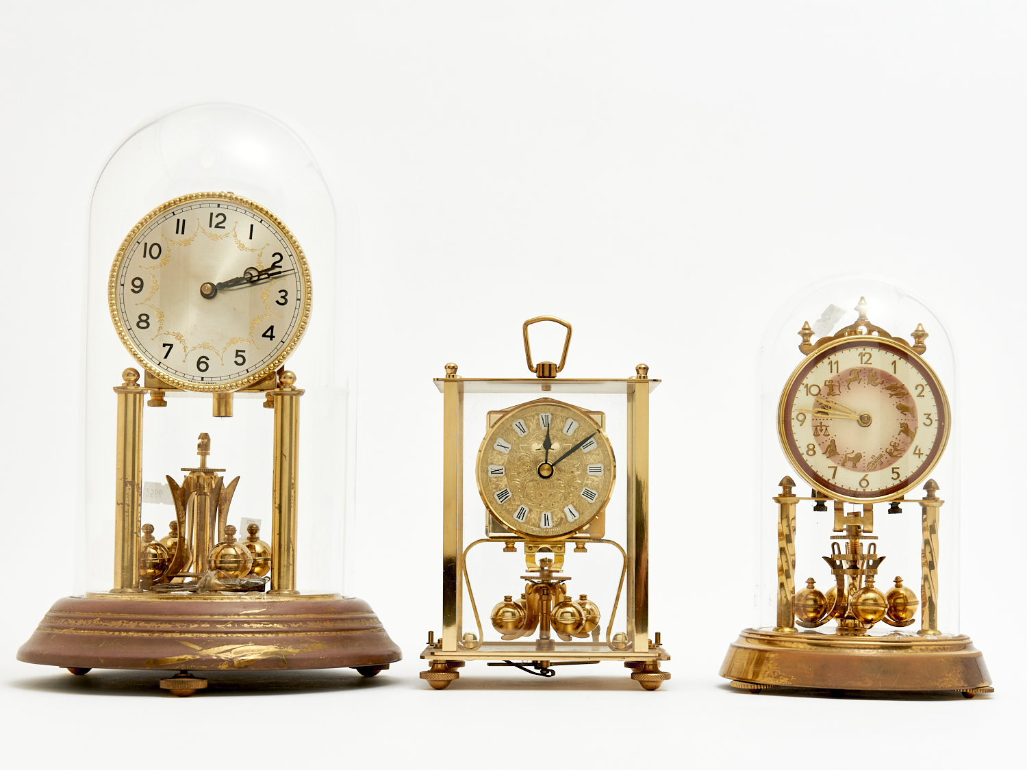 THREE GERMAN BRASS AND GLASS DOME EIGHT-DAY CLOCKS WITH KEYS H.32CM (TALLEST), LEONARD JOEL LOCAL DELIVERY: MEDIUM