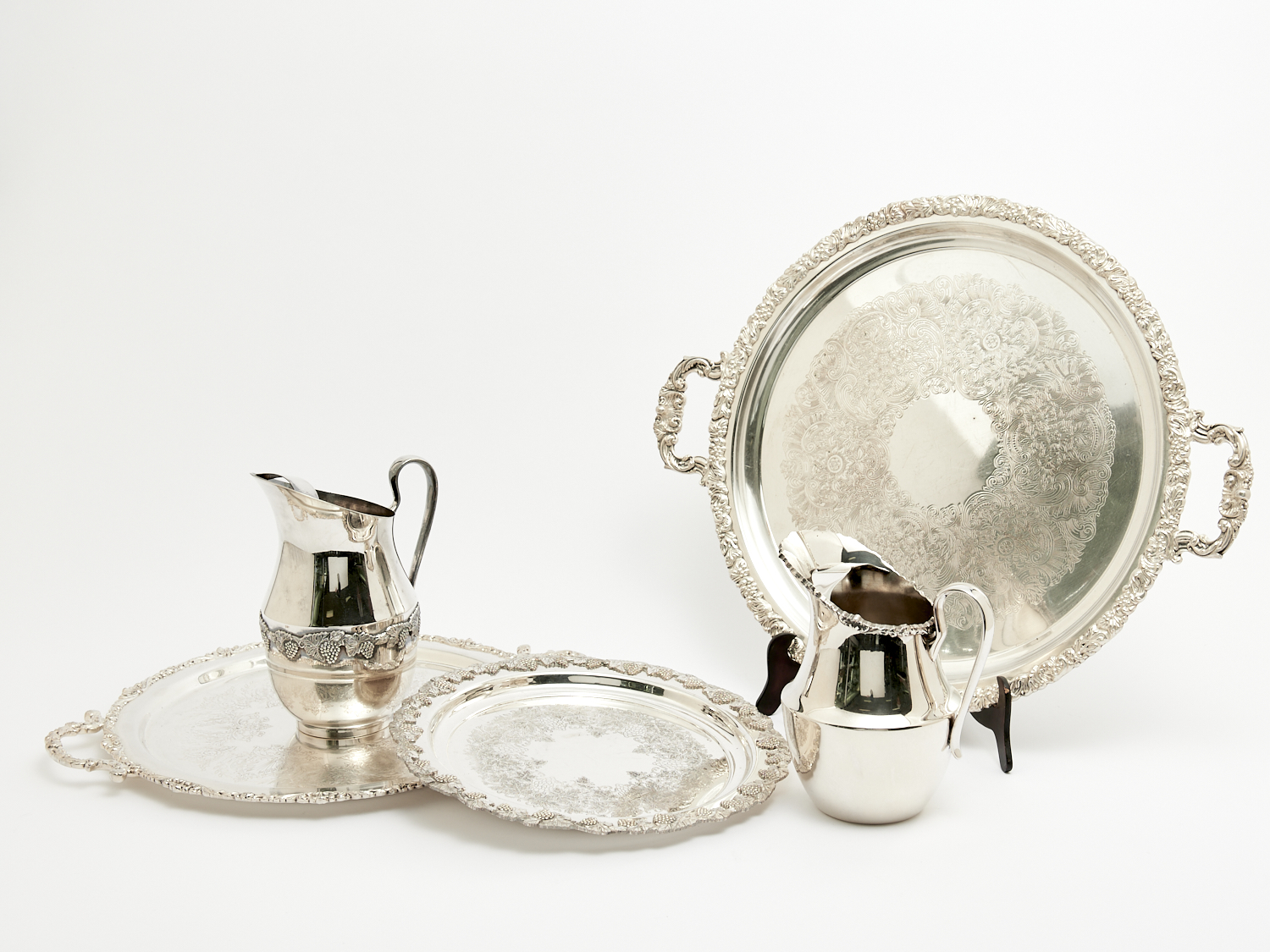 THREE VINTAGE ENGLISH SILVER PLATE TRAYS AND TWO MATCHED WATER JUGS DIA.51CM (LARGEST) LEONARD JOEL LOCAL DELIVERY: MEDIUM