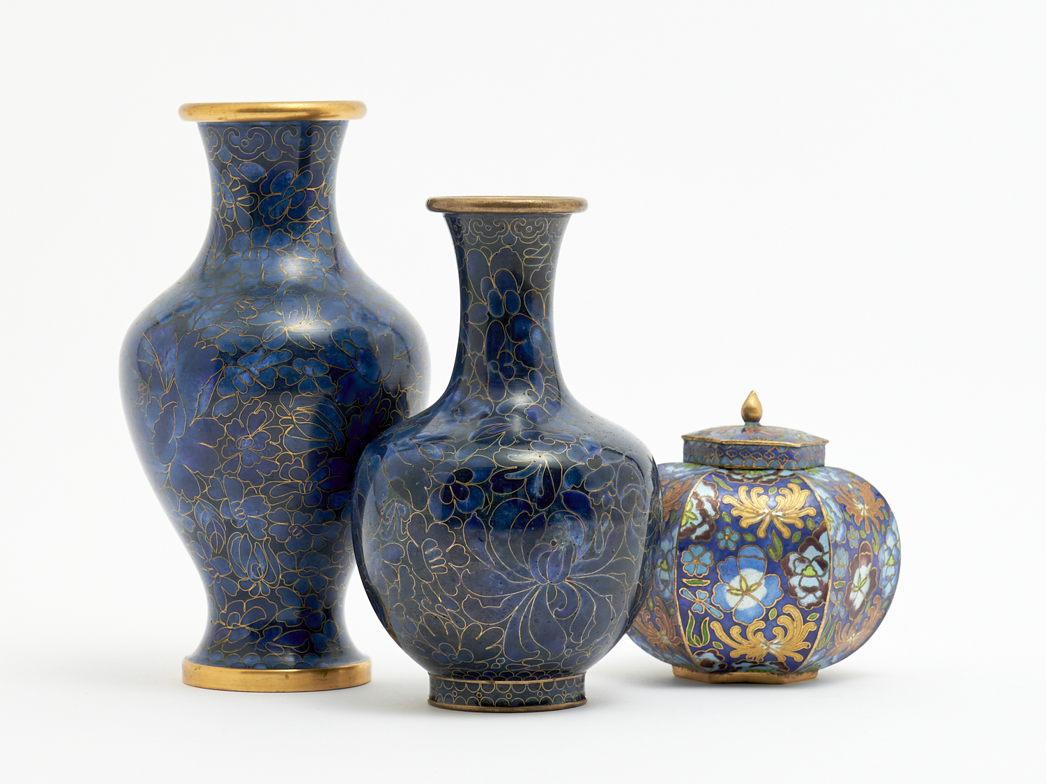TWO CHINESE CLOISONNE VASES AND LIDDED HEXAGONAL BOX H.19CM (TALLEST), LEONARD JOEL LOCAL DELIVERY: MEDIUM
