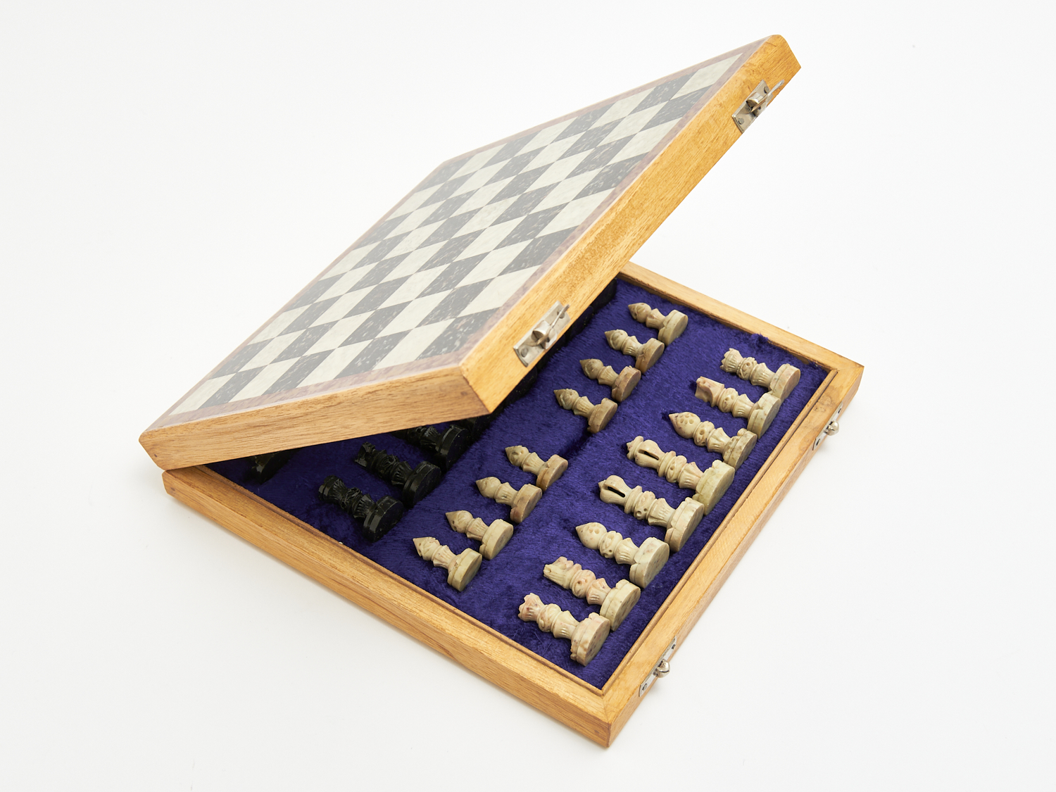 A BOXED CARVED STONE CHESS SET WITH INCORPORATED MARBLE INLAID BOARD W.25.5CM, LEONARD JOEL LOCAL DELIVERY: SMALL