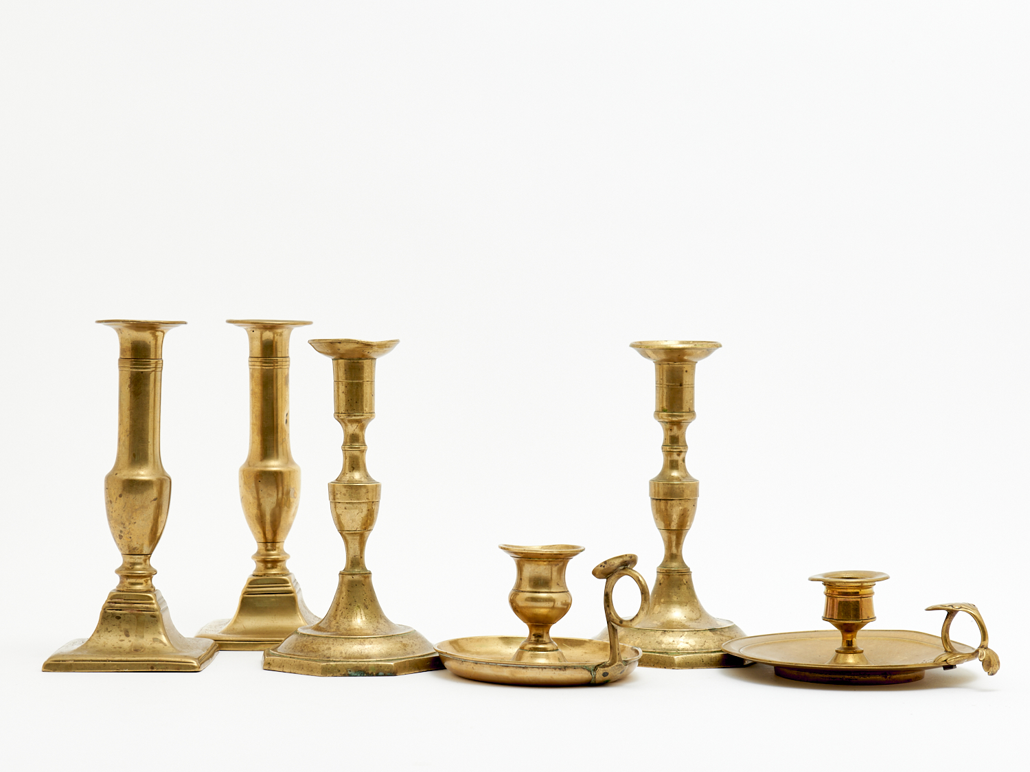 THREE PAIRS OF ANTIQUE BRASS CANDLESTICKS AND TWO CHAMBER STICKS H.19CM (TALLEST), LEONARD JOEL LOCAL DELIVERY: MEDIUM