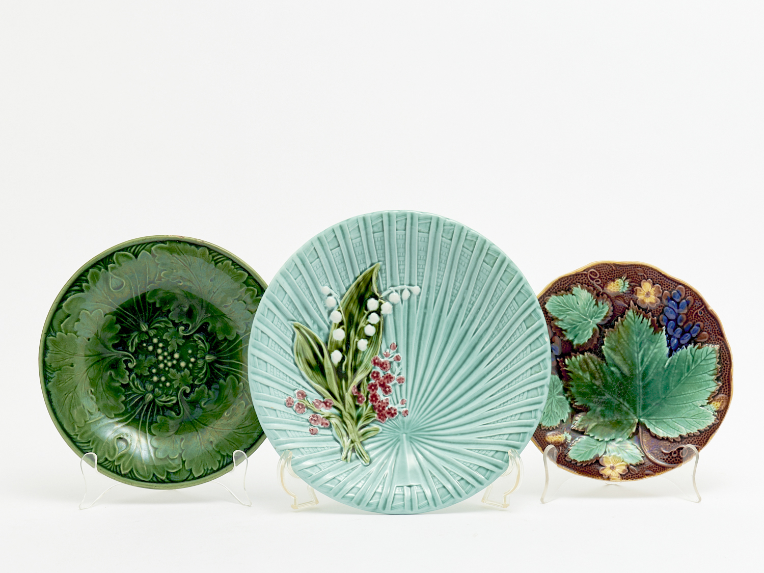 THREE 19TH C. ENGLISH MAJOLICA PLATES DIA.25CM, LEONARD JOEL LOCAL DELIVERY: SMALL