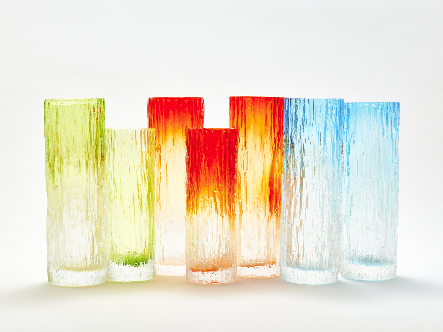 SEVEN RETRO CIRCULAR GLASS VASES IN ORANGE GREEN AND BLUE TONES H.23.5CM (TALLEST), LEONARD JOEL LOCAL DELIVERY: MEDIUM