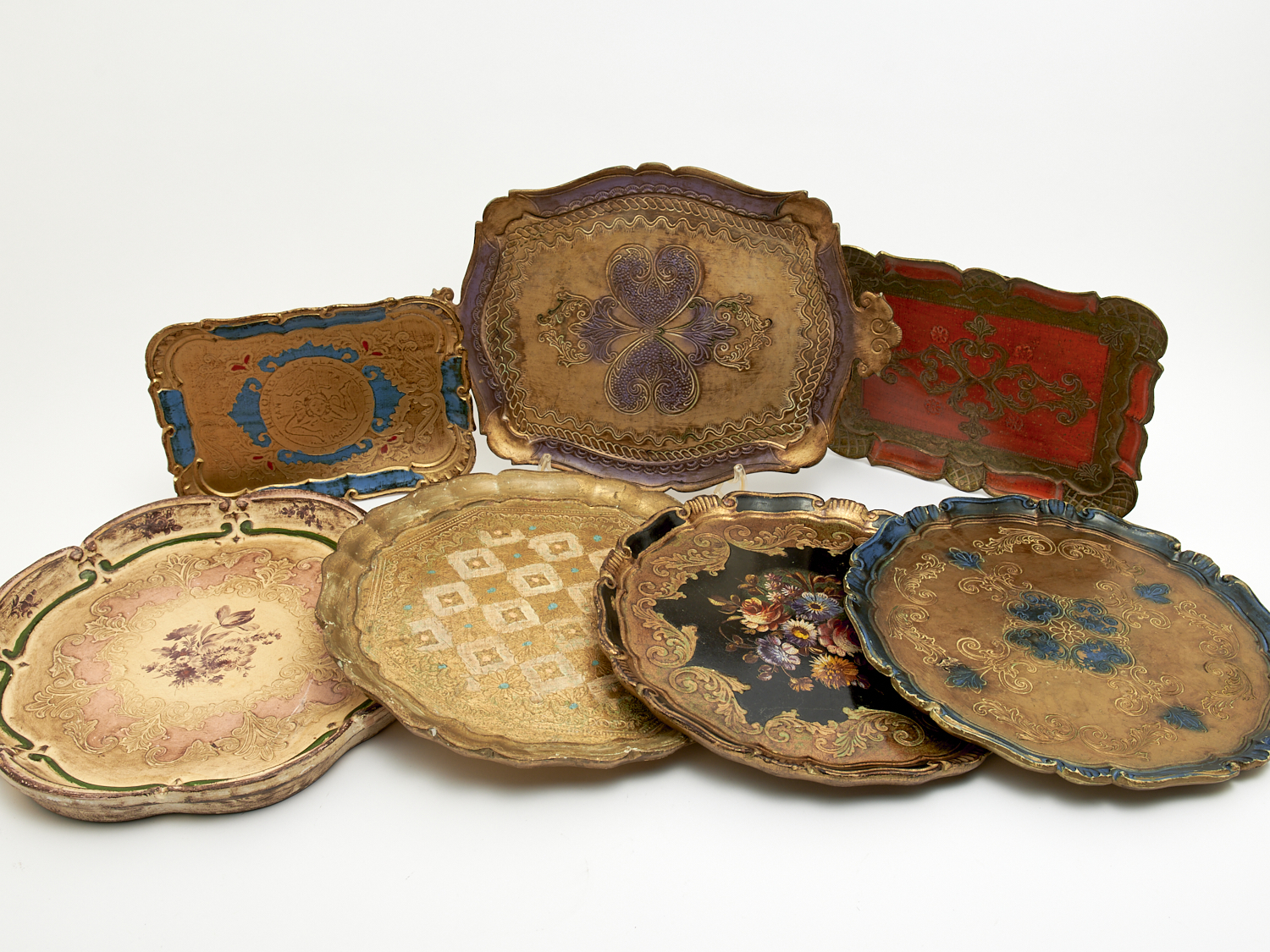 SEVEN VINTAGE GILTWOOD FLORENTINE TRAYS W.37CM (WIDEST), LEONARD JOEL LOCAL DELIVERY: MEDIUM