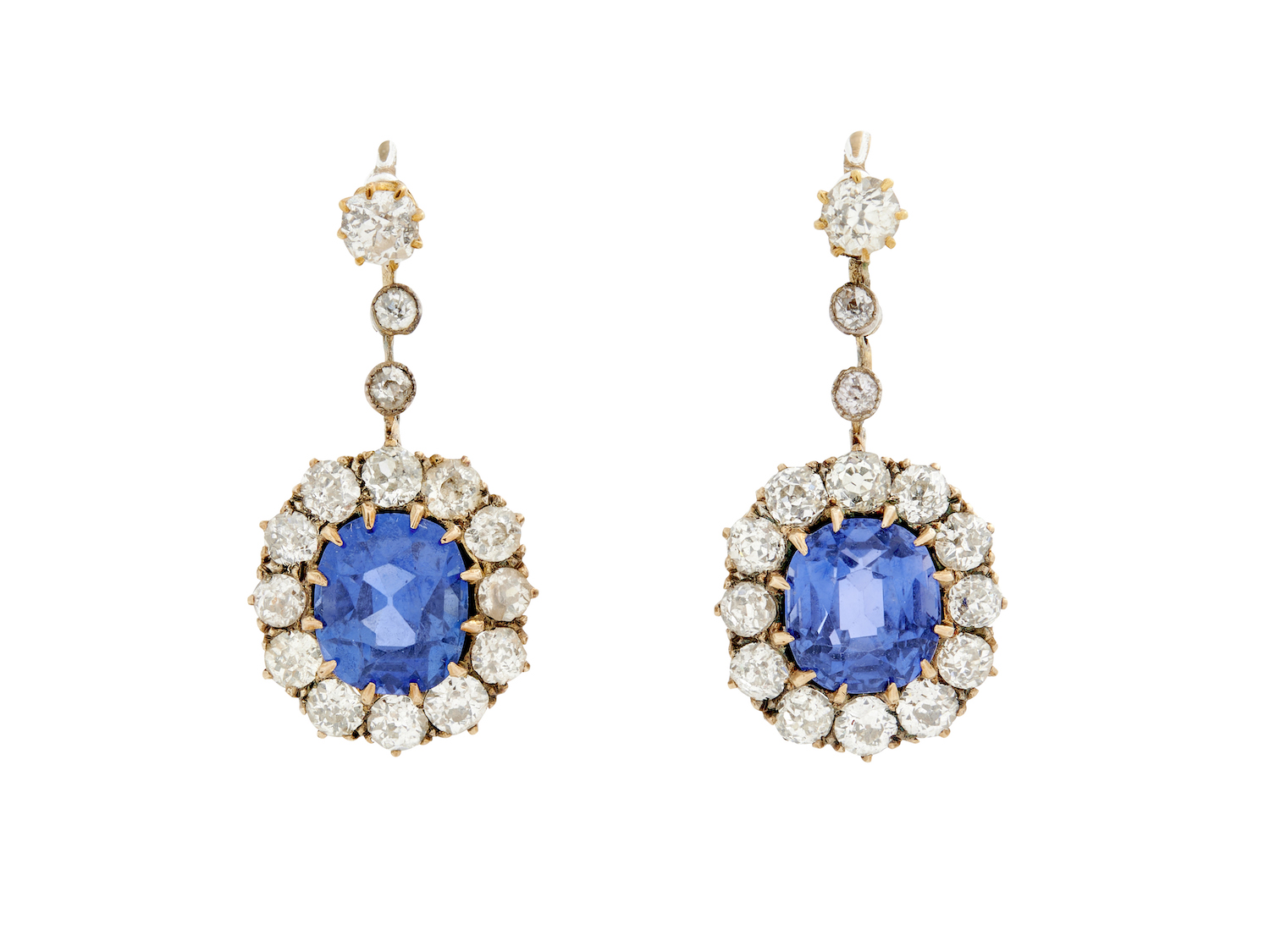 Each earring comprising a claw-set cushion-cut sapphire and brilliant-cut diamond cluster, suspended from a diamond-set knife bar drop and solitaire diamond surmount, the sapphires together weighing approximately 4.50, the diamonds together weighing approximately 1.70 carats, to post and screwback fittings, length 25mm.
