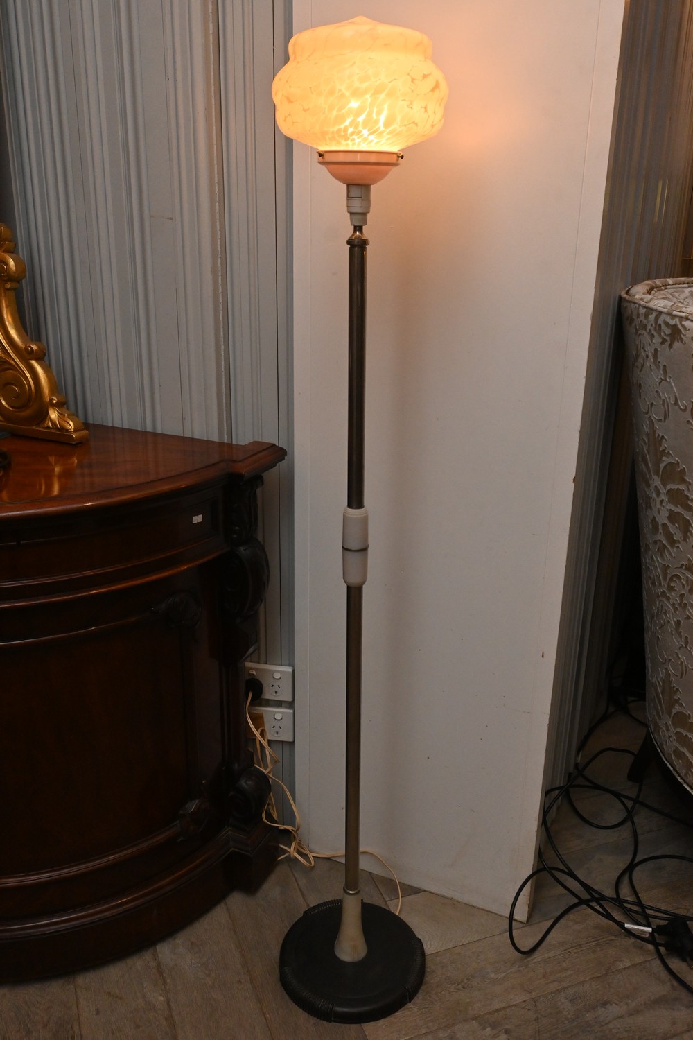 AN ART DECO BAKELITE AND CHROME LAMP WITH ORIGINAL GLASS SHADE (155H CM) (LEONARD JOEL DELIVERY SIZE: LARGE)