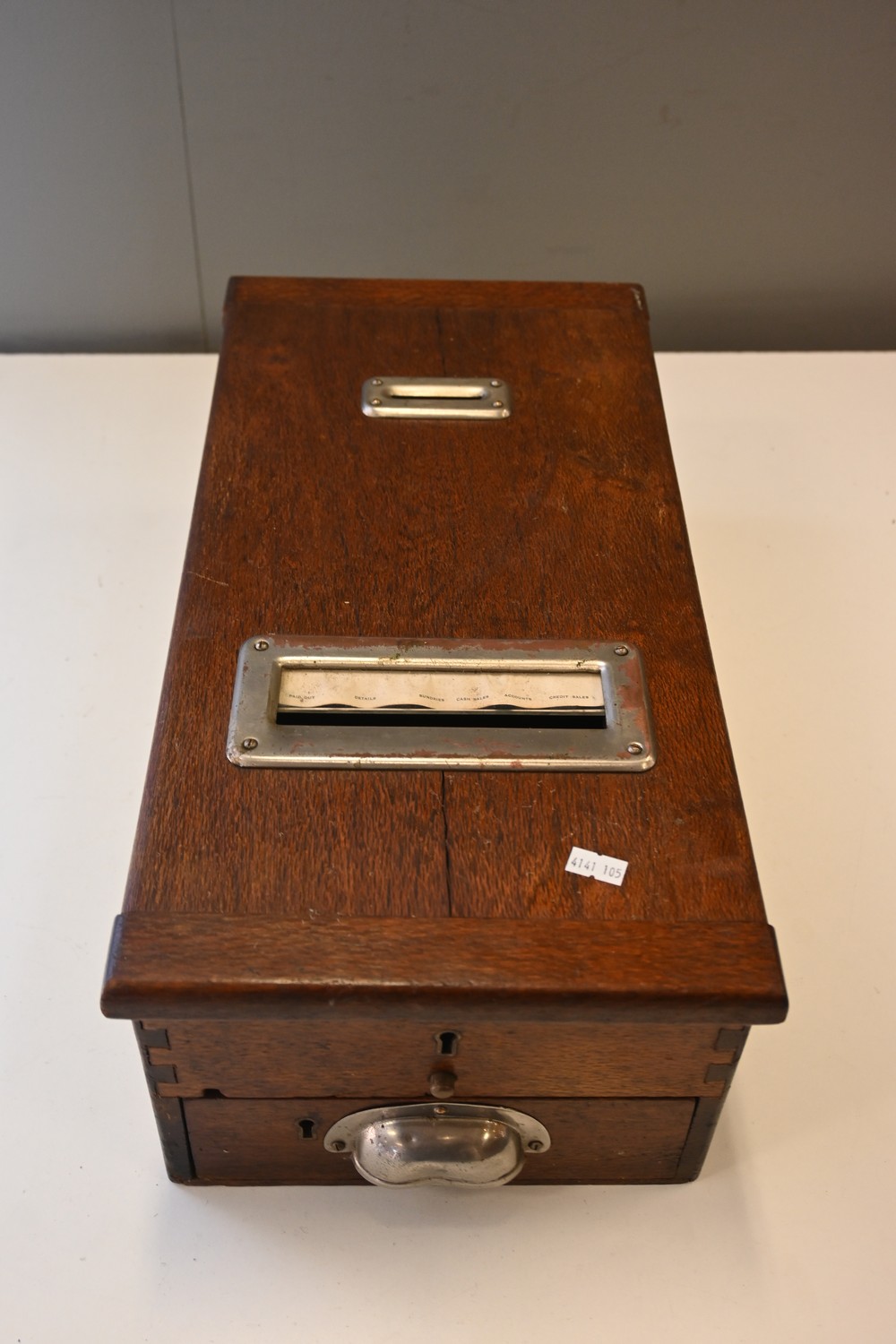 AN EARLY 20TH CENTURY AUSTRALIAN OAK PAYMENTS DRAW WITH ORIGINAL BELL AND GLASS SLOTS (A/F) (17H X 24W X 50D CM) (LEONARD JOEL DELIVERY SIZE: LARGE)