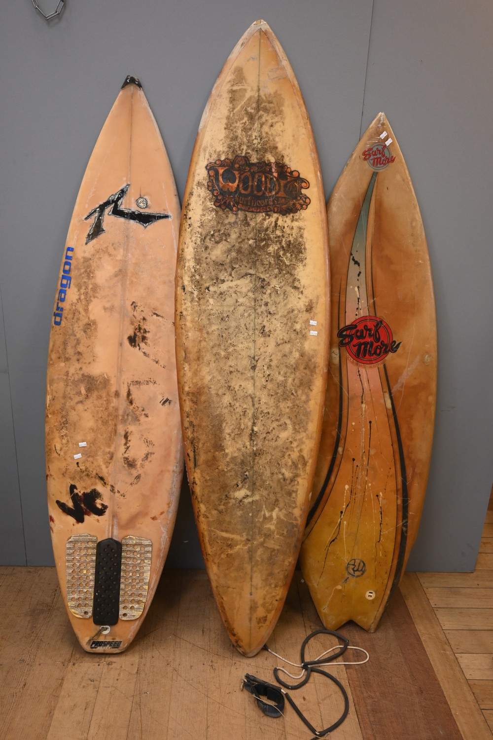 A COLLECTION OF THREE VINTAGE AUSTRALIAN FIBERGLASS SURFBOARDS (A/F) (180H X 48W CM) (LEONARD JOEL DELIVERY SIZE: X-LARGE)