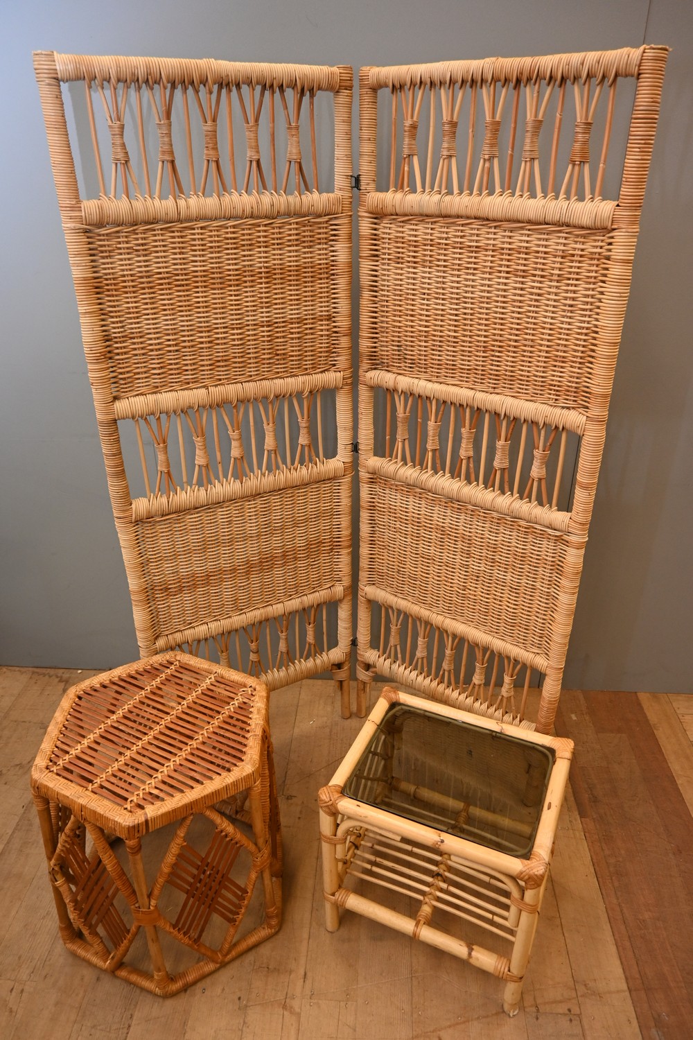 A CANE WOVEN TWO PANEL SCREEN AND TWO CANE SIDE TABLES (A/F) (160H X 55W PER PANEL) (LEONARD JOEL DELIVERY SIZE: LARGE)