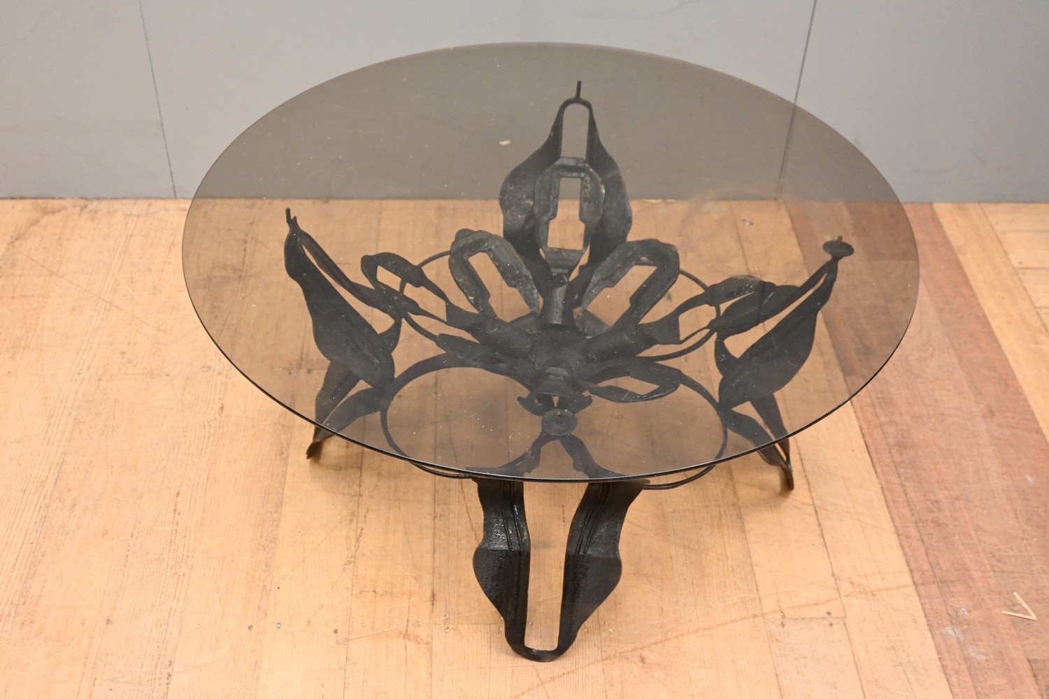 A BRUTALIST WROUGHT IRON CIRCULAR GLASS TOPPED COFFEE TABLE (A/F) (43H X 89DIA CM) (LEONARD JOEL DELIVERY SIZE: X-LARGE)
