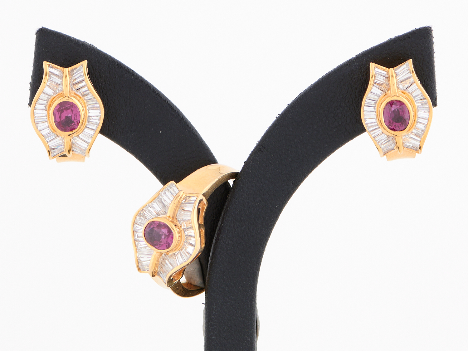A DIAMOND AND RUBY SUITE COMPRISING A RING AND EARRINGS IN 18CT GOLD, RING SIZE M/N, EARRINGS TO POST AND LEVER BACK FITTINGS, ACCOMPANIED BY VALUATION, 12.5GMS