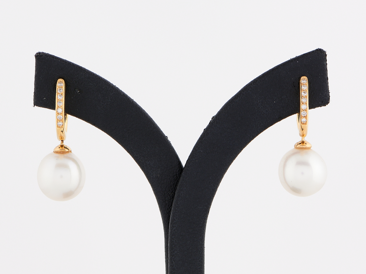 A PAIR OF DIAMOND AND PEARL EARRINGS IN 18CT GOLD, TO POST AND LEVER BACK FITTINGS, THE PEARLS MEASURING 10MM, LENGTH 25MM, 5.6GMS, ACCOMPANIED BY VALUATION