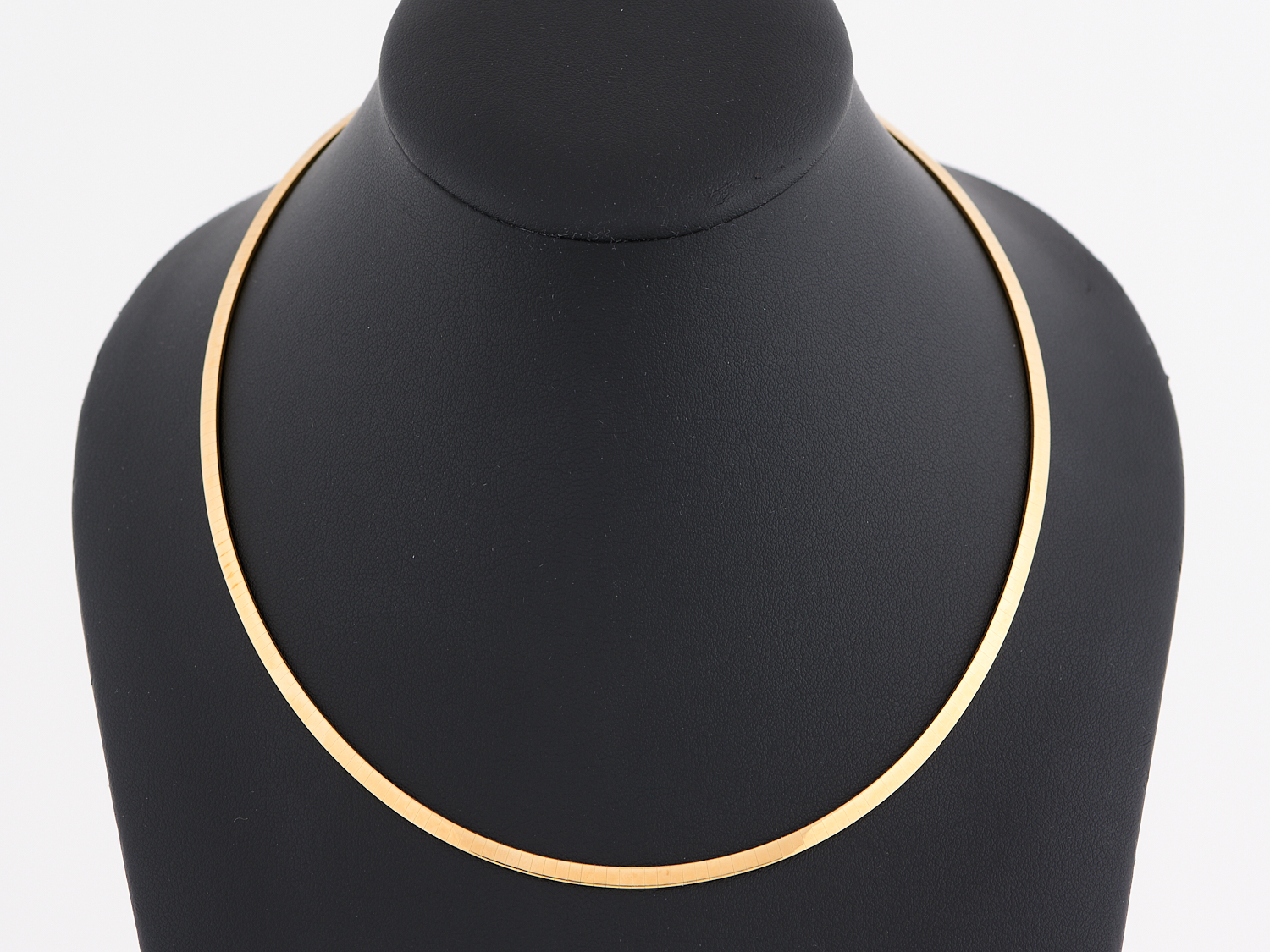 A FLAT COLLAR NECKLACE IN 18CT GOLD, THE COLLAR MEASURING 3.1MM WIDE, ACCOMPANIED BY VALUATION, 20.1GMS