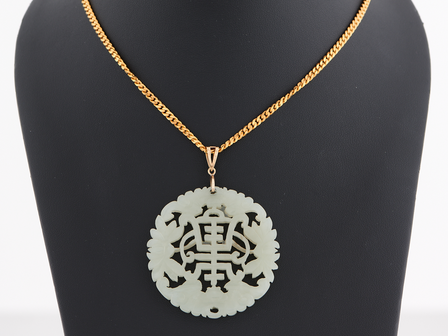A PIERCED JADE PLAQUE TO A CHAIN IN 22CT GOLD, THE PENDANT DIAMETER 50MM