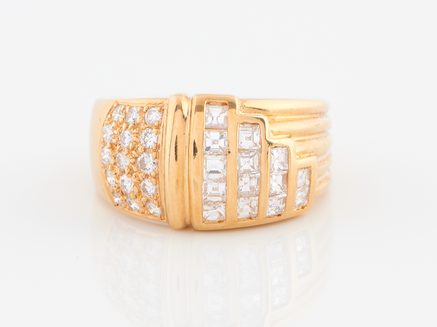 A DIAMOND RING IN 18CT GOLD, FEATURING FIFTEEN BRILLIANT CUT DIAMONDS TOTALLING 0.37CTS WITH CARRE CUT DIAMONDS TOTALLING 1.20CTS (G/VS), RING SIZE N/O, 9.0GMS