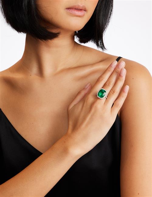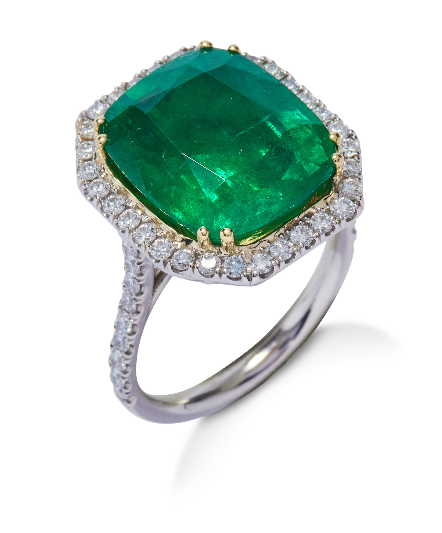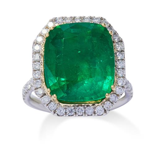 Of cluster design, centring a claw-set cushion-shaped emerald weighing approximately 10.60 carats, framed by a halo of brilliant-cut diamonds to similarly set shoulders, the small diamonds together weighing approximately 0.79 carats, mounted in platinum and 18ct gold, size M1/2.