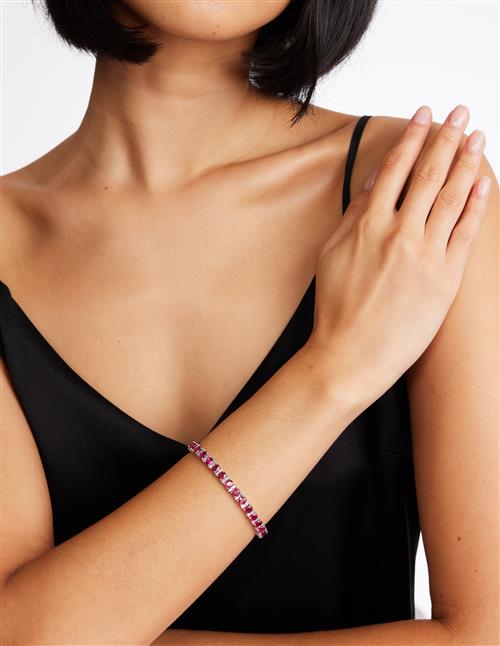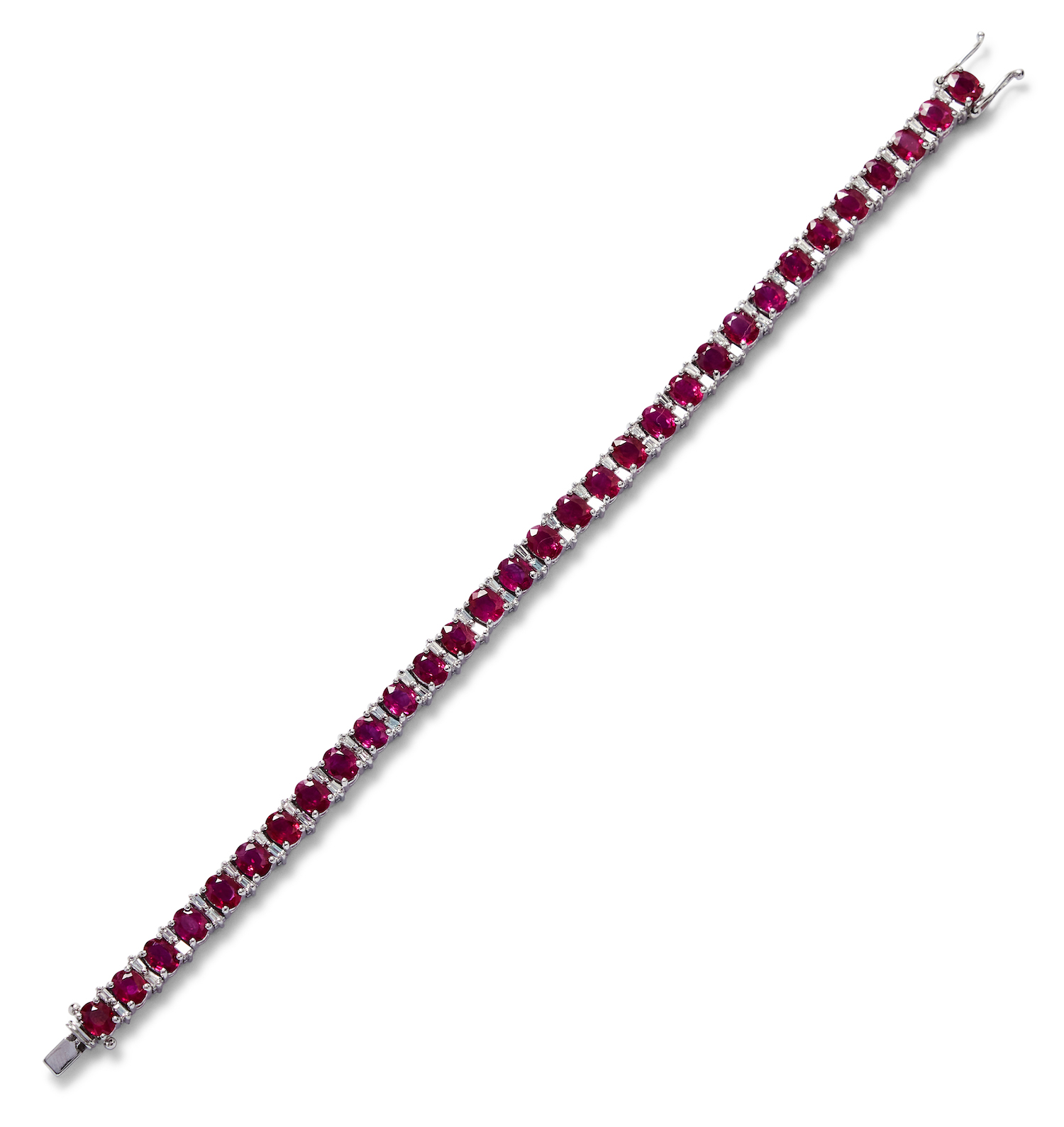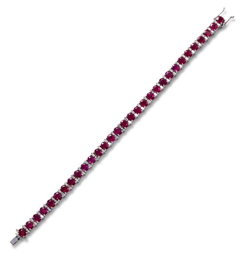 Composed of a line of 31 claw-set oval-shaped rubies between similarly set baguette diamonds completed by a concealed box clasp, the rubies and diamonds together weighing approximately 11.70 carats and 1.50 carats respectively, mounted in platinum, length 175mm.