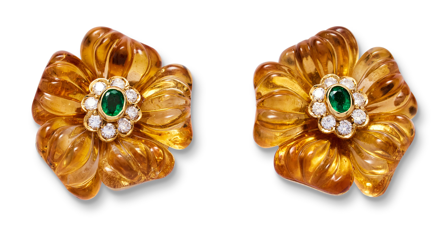 Each designed as a flowerhead, the stamen collet-set with an oval-shaped emerald framed by brilliant-cut diamonds to carved citrine petals, the diamonds together weighing approximately 0.40 carats, mounted in 18ct gold, diameter 25mm, post and clip fittings.