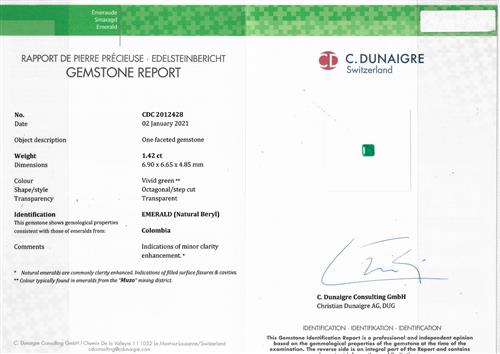 a C. Dunaigre report numbered CDC 2012428 dated 2 January 2021, stating that the 1.42 carat vivid green emerald is natural, with indications of minor clarity enhancement, of Colombia origin;