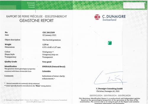 a C. Dunaigre report numbered CDC 2012509 dated 2 January 2021, stating that the 1.29 carat vivid green emerald is natural, with indications of minor clarity enhancement, of Colombia origin.