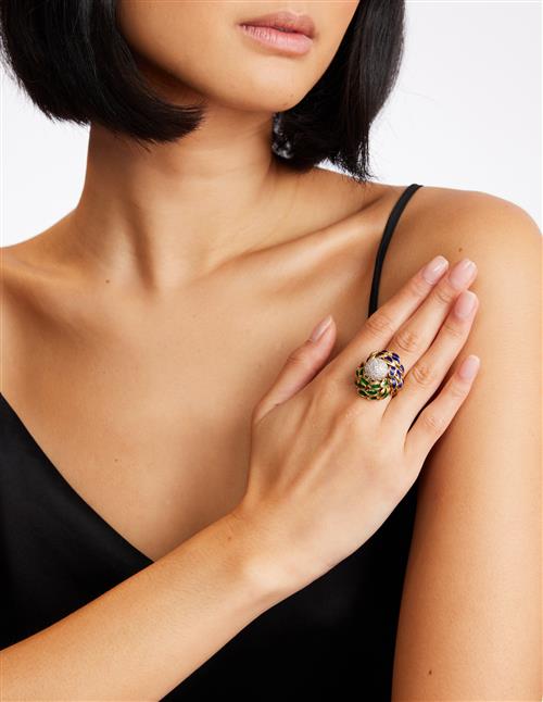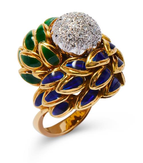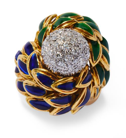 Modelled as a bombé styled flowerhead, the stamen of dome design pavé-set with brilliant-cut diamonds between openwork sculptured petals applied with green and blue enamel, the small diamonds together weighing approximately 0.35 carats, mounted in 18ct gold, size N, numbered, signed Cartier.