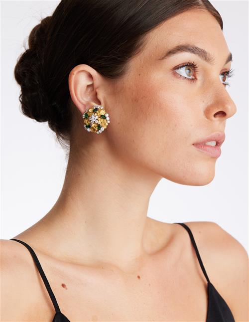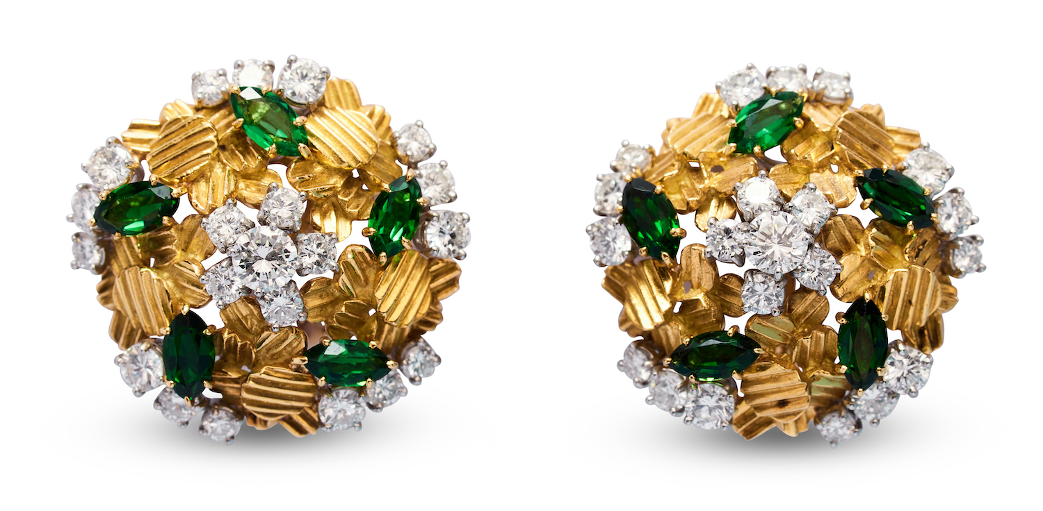 Each modelled as a starburst, centring a cluster of claw-set brilliant-cut diamonds framed by an asymmetrical surround of textured gold plaques decorated at intervals with claw-set marquise-shaped green tourmaline between brilliant-cut diamonds, the diamonds and tourmalines stated to weigh 4.91 carats and 4.06 carats respectively, mounted in 14ct gold, diameter 28mm, post and clip fittings, maker's mark for Jacques Timey, for Harry Winston.