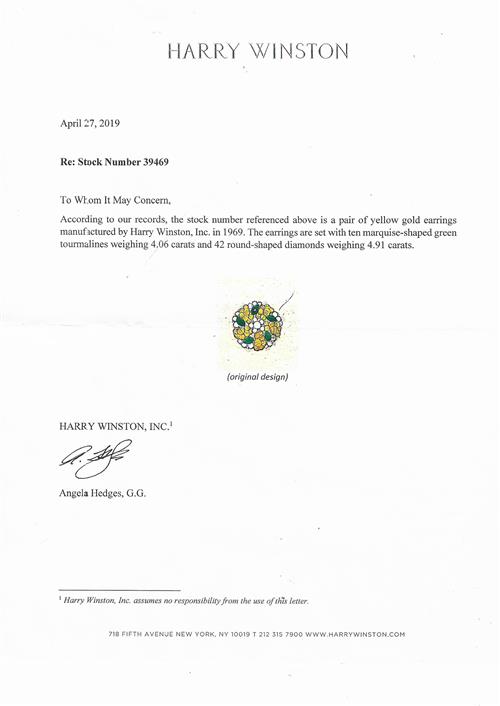HARRY WINSTON PAIR OF DIAMOND AND GREEN TOURMALINE EARRINGS, CIRCA 1969