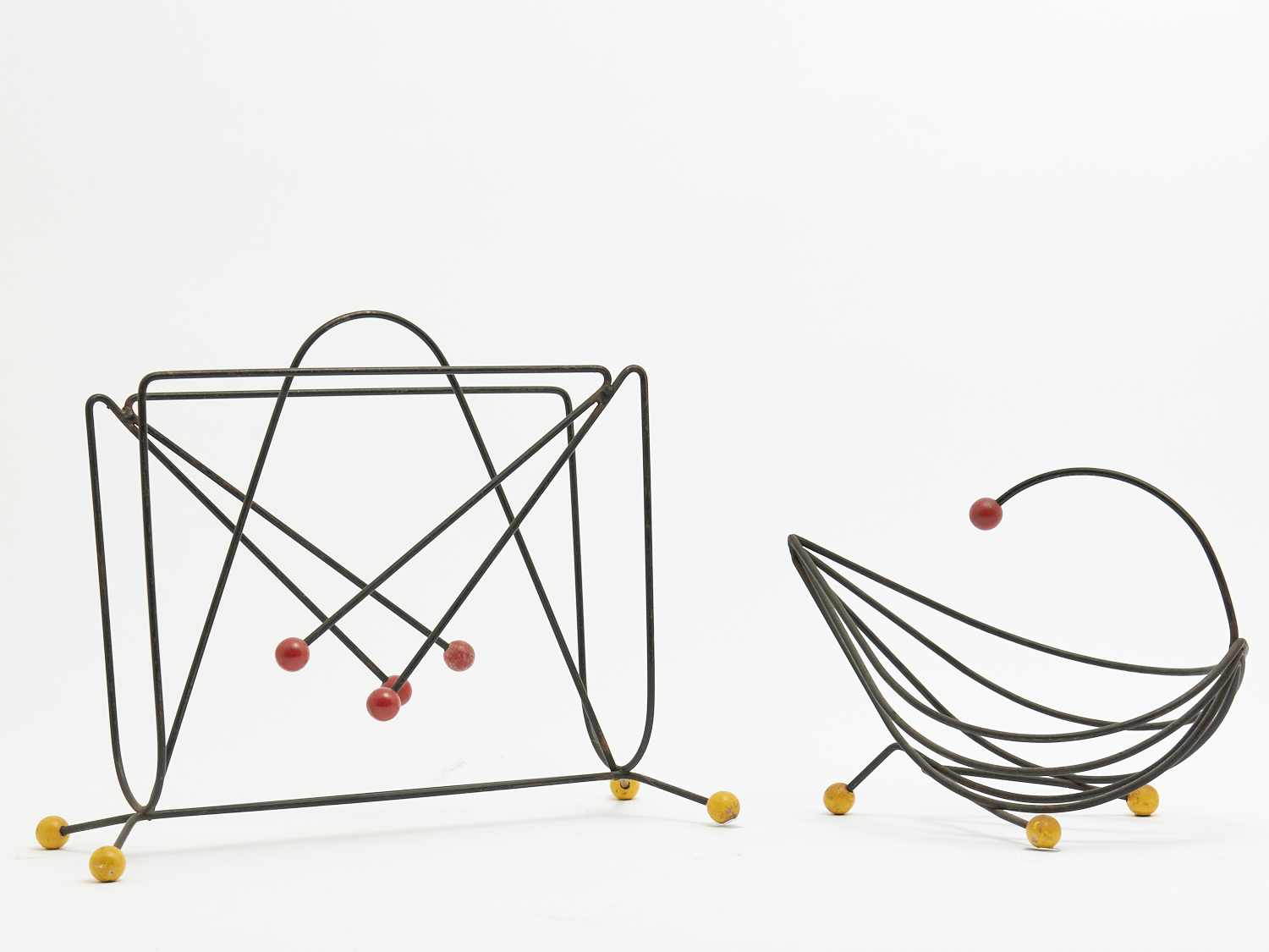A MID-CENTURY ATOMIC STYLE WIRE BASKET AND MAGAZINE RACK H.31CM (TALLEST), LEONARD JOEL LOCAL DELIVERY: MEDIUM