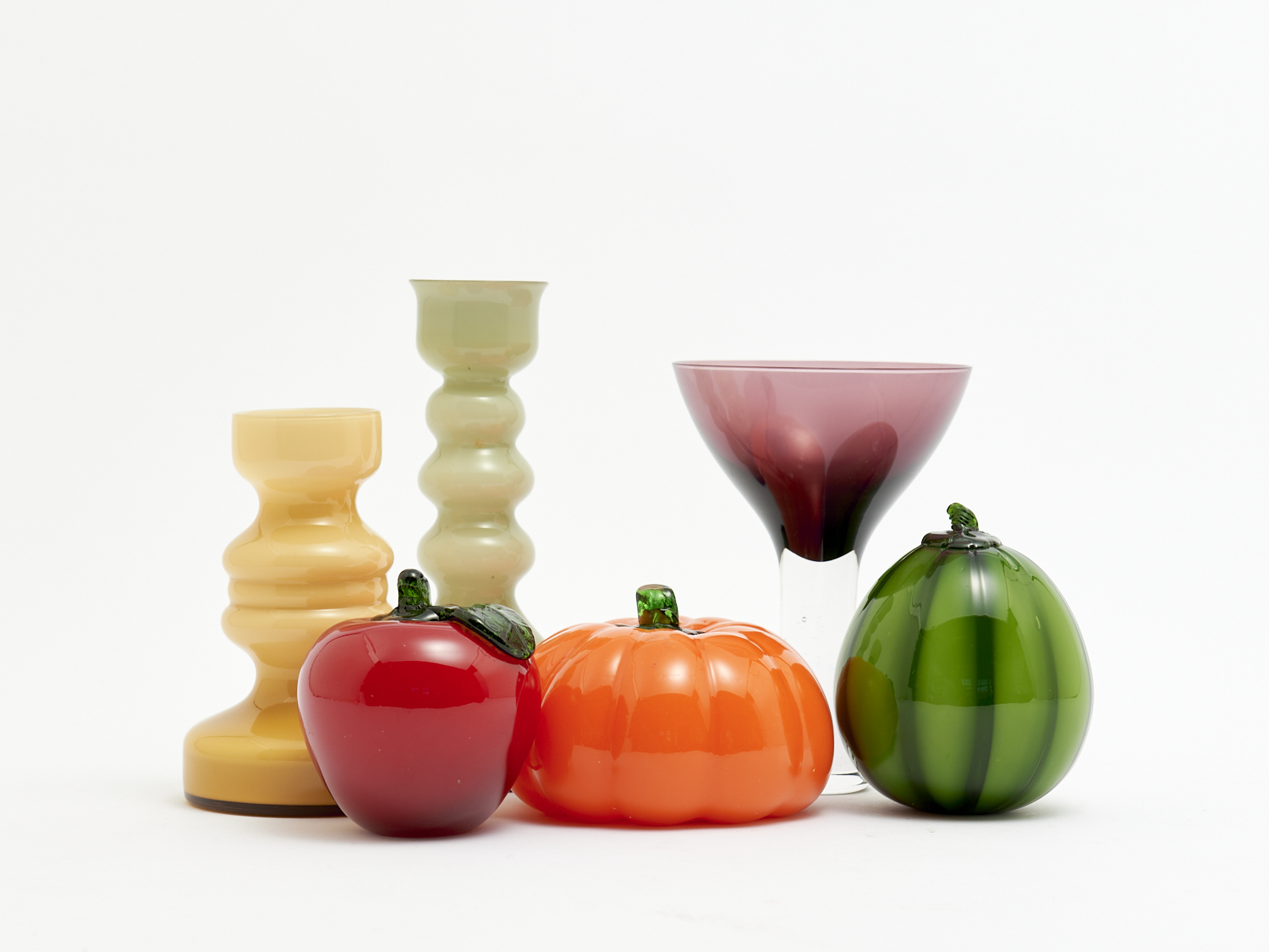 A GROUP OF GLASS FRUIT, CANDLE STICKS AND A FOOTED BOWL H.20.5CM (TALLEST), LEONARD JOEL LOCAL DELIVERY: MEDIUM