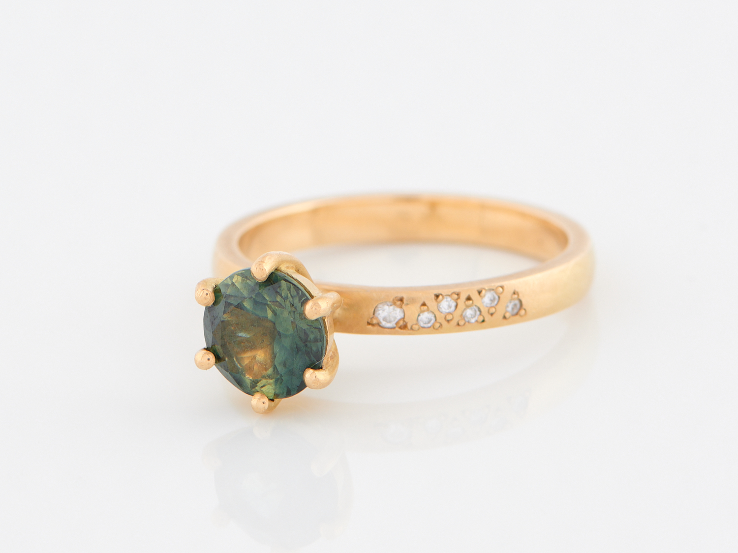 AMY RENSHAW FOR PIECES OF EIGHT, A SAPPHIRE AND DIAMOND RING IN 18CT GOLD, RING SIZE N, THE SAPPHIRE OF 6.8MM, 4.1GMS, ACCOMPANIED BY PIECES OF EIGHT BOX