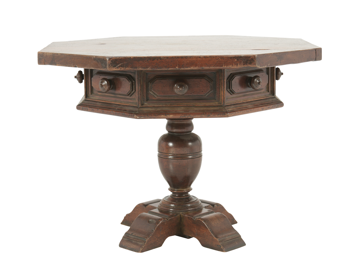 The removable octagonal top above a moulded frieze with a drawer to one side and conforming false drawer fronts to all other sides, raised on a baluster pedestal and crossed sled feet, stained and distressed to simulate well-patinated walnut