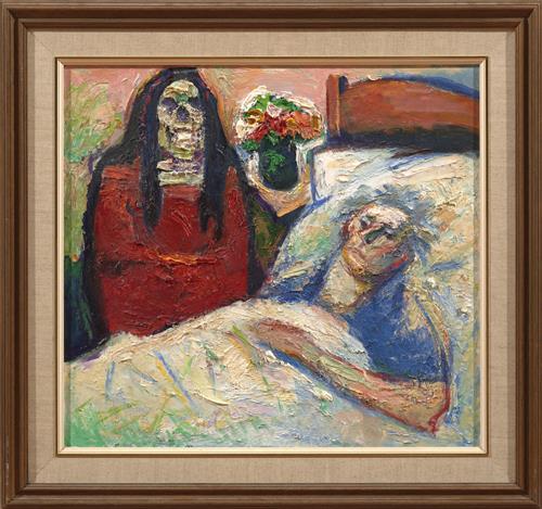 After suffering a cardiac arrest and stroke in 1981, Counihan feared the end of his creative practice. In 1983, he painted Confrontation - "not intended as a self portrait but as a generalised portrait of a man, stressing his vulnerability and his mortality". (p. 44)