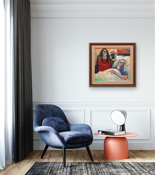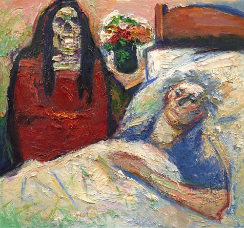 In the painting, he modifies the traditional death figure from a scythe-carrying figure to a long-haired feminine figure in the Greek tradition where she would carry off the wounded and dying to the gods. In the centre of the work, the bouquet of flowers is a symbol of life and mortality. After perservering through his illness and completing this painting, Counihan noted: "There is a celebration in this picture because this is where I really say to myself 'It's not over yet!'".