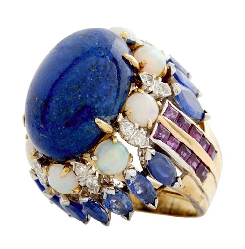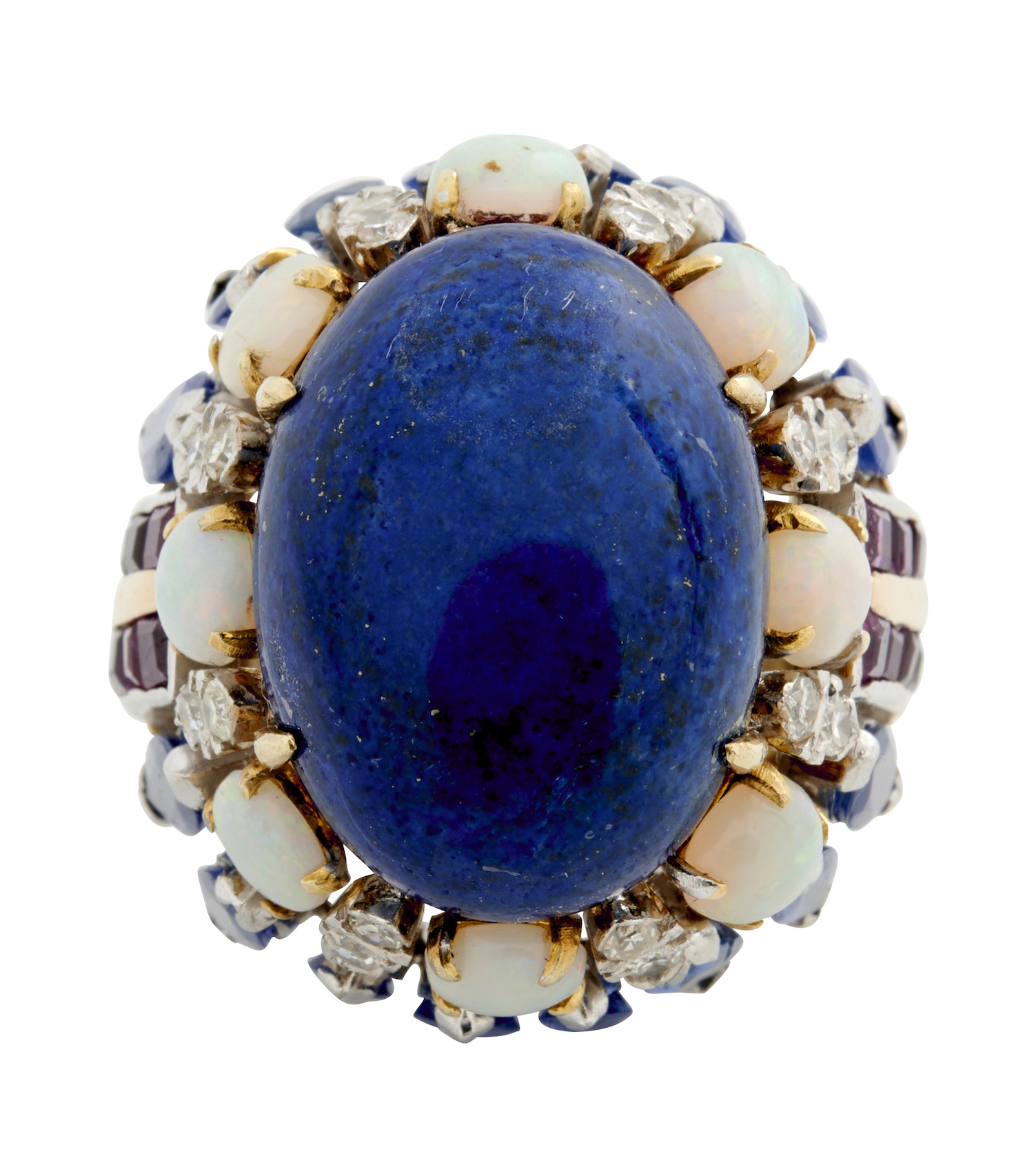 Of bombé design, centring a claw-set oval lapis cut en cabochon weighing approximately 12.40 carats, within a surround of circular cabochon opals and pairs of brilliant-cut diamonds, within a further surround of marquise-cut sapphires, to shoulders channel-set with carre-cut rubies, the diamonds together weighing approximately 0.36 carats, the sapphires together weighing approximately 3.00 carats, the rubies together weighing approximately 0.40 carats, size H 1/2.