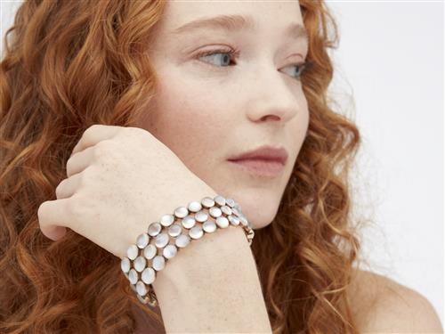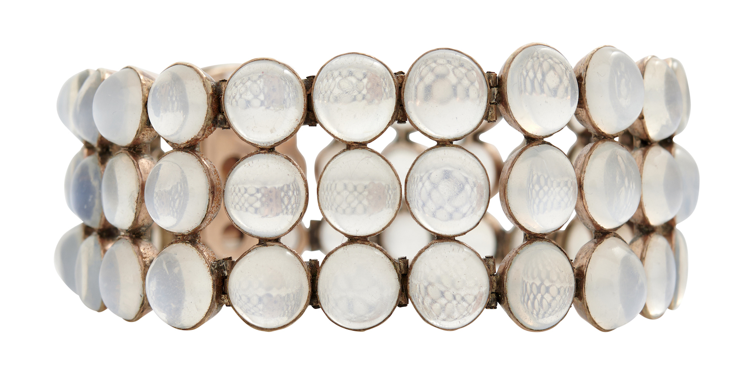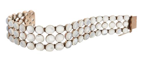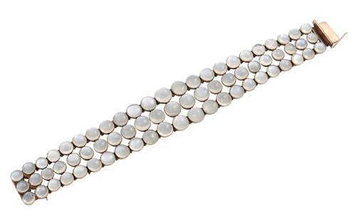 Comprising three rows of graduating circular cabochon moonstones together weighing approximately 42.00 carats, completed by a tongue and groove clasp, length approximately 185mm.