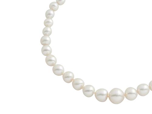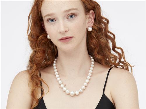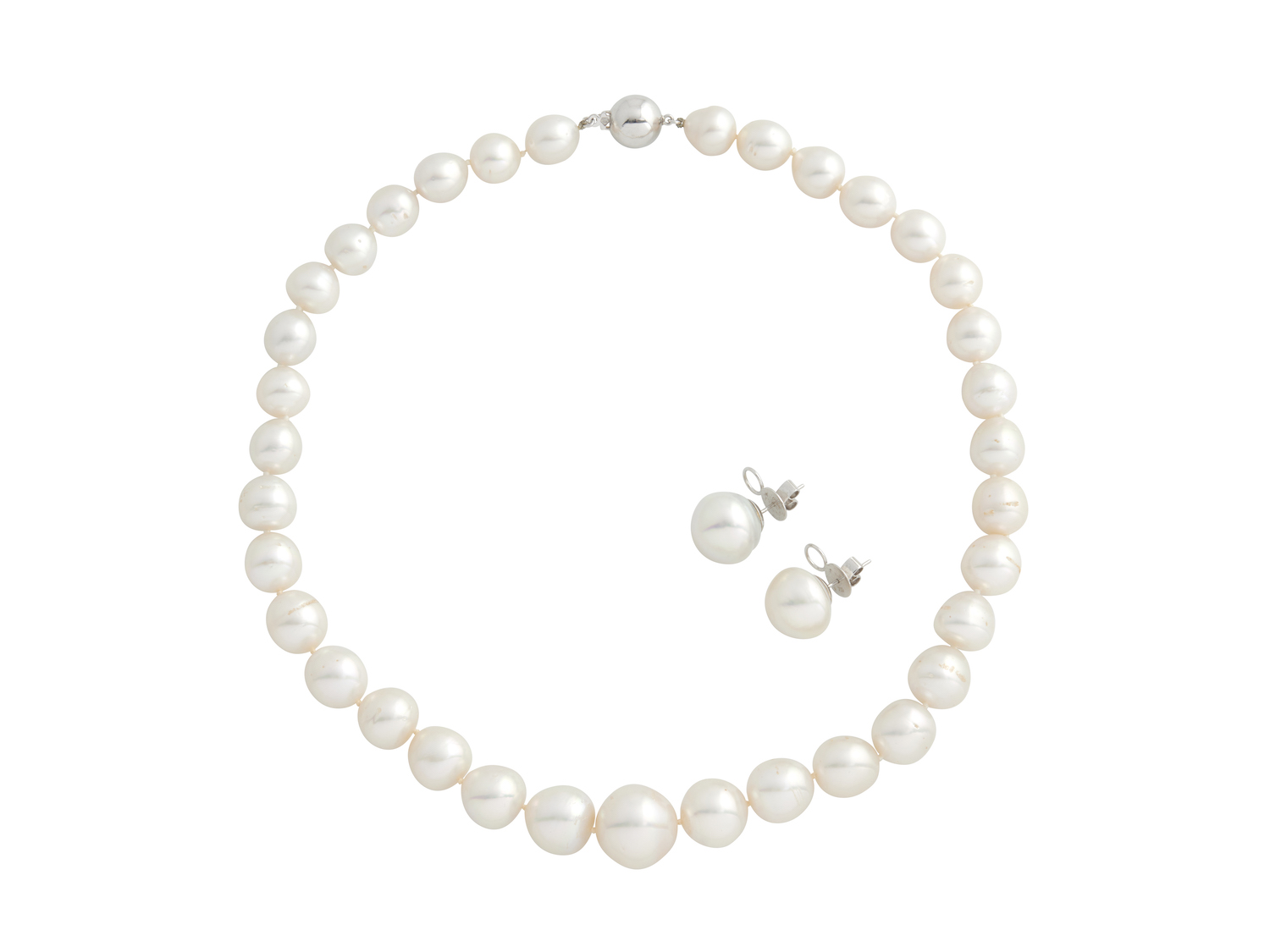 Comprising a strand of thirty-five graduating semi-baroque pearls of white hues measuring approximately 10.90mm to 17.60mm, completed by a ball clasp in 18ct white gold; earrings ensuite, each comprising a semi-baroque pearl measuring approximately 15.50mm, to post and butterfly fittings, necklace length approximately 500mm.