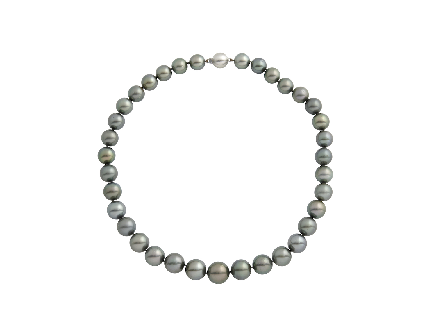 Comprising thirty-five graduating round pearls of grey hues measuring approximately 11.00mm to 14.40mm, completed by a ball clasp in 18ct white gold, length approximately 465mm.