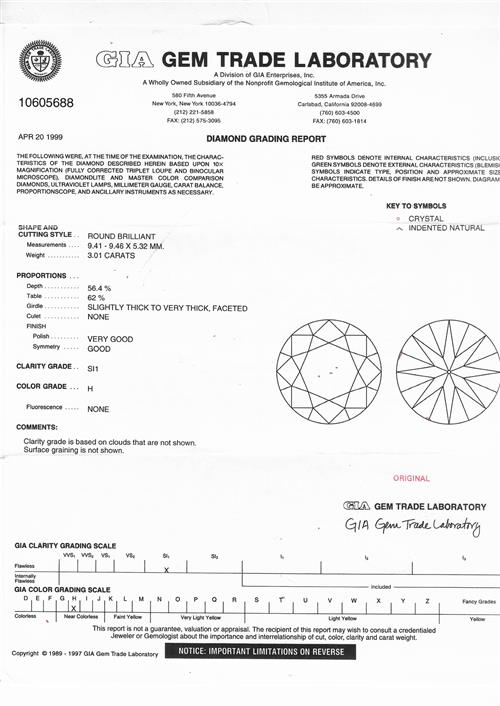 a GIA report numbered 10605688, dated 20 April 1999, stating that the 3.01 carat diamond is natural, H colour, SI1 clarity;