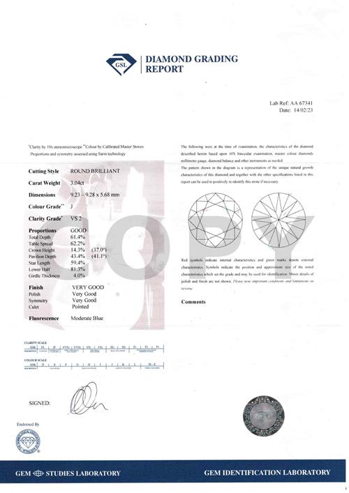 a GSL report numbered AA67341, dated 14 February 2023, stating that the 3.04 carat diamond is natural, J colour, VS2 clarity.