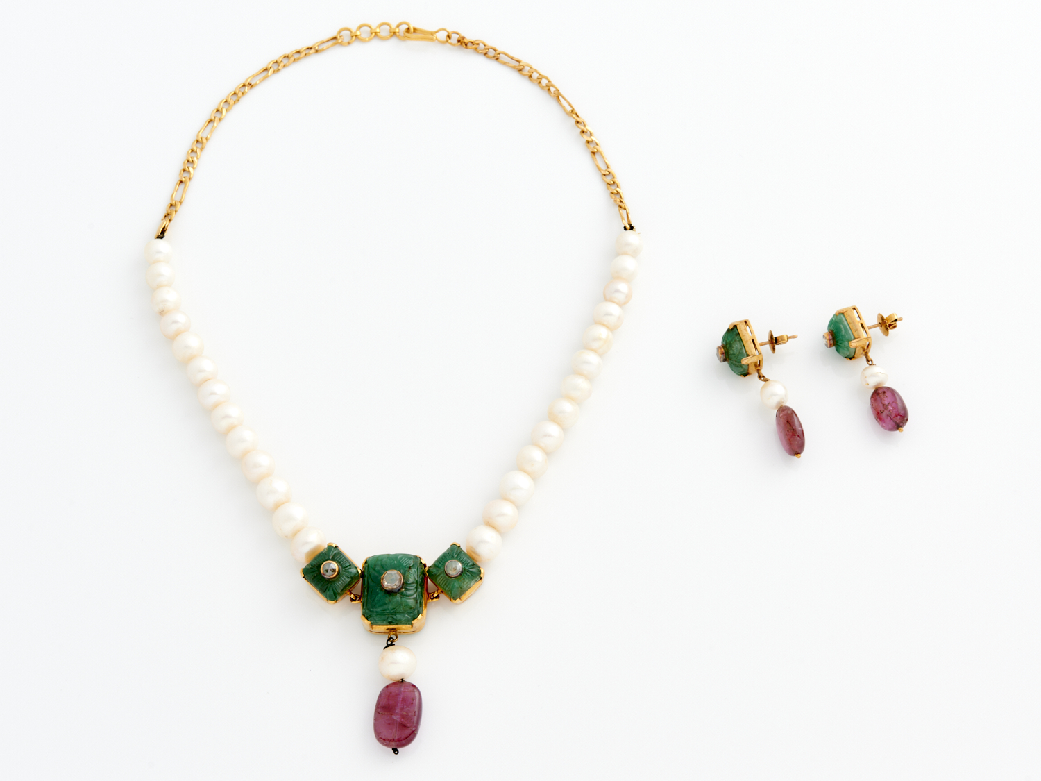 A FRESHWATER PEARL, EMERALD, DIAMOND AND TOURMALINE JEWELLERY SUITE IN 18CT GOLD, INCLUDING A NECKLACE, LENGTH 480MM, AND EARRINGS TO POST AND BUTTERFLY FITTINGS, LENGTH 38MM, ACCOMPANIED BY A POUCH
