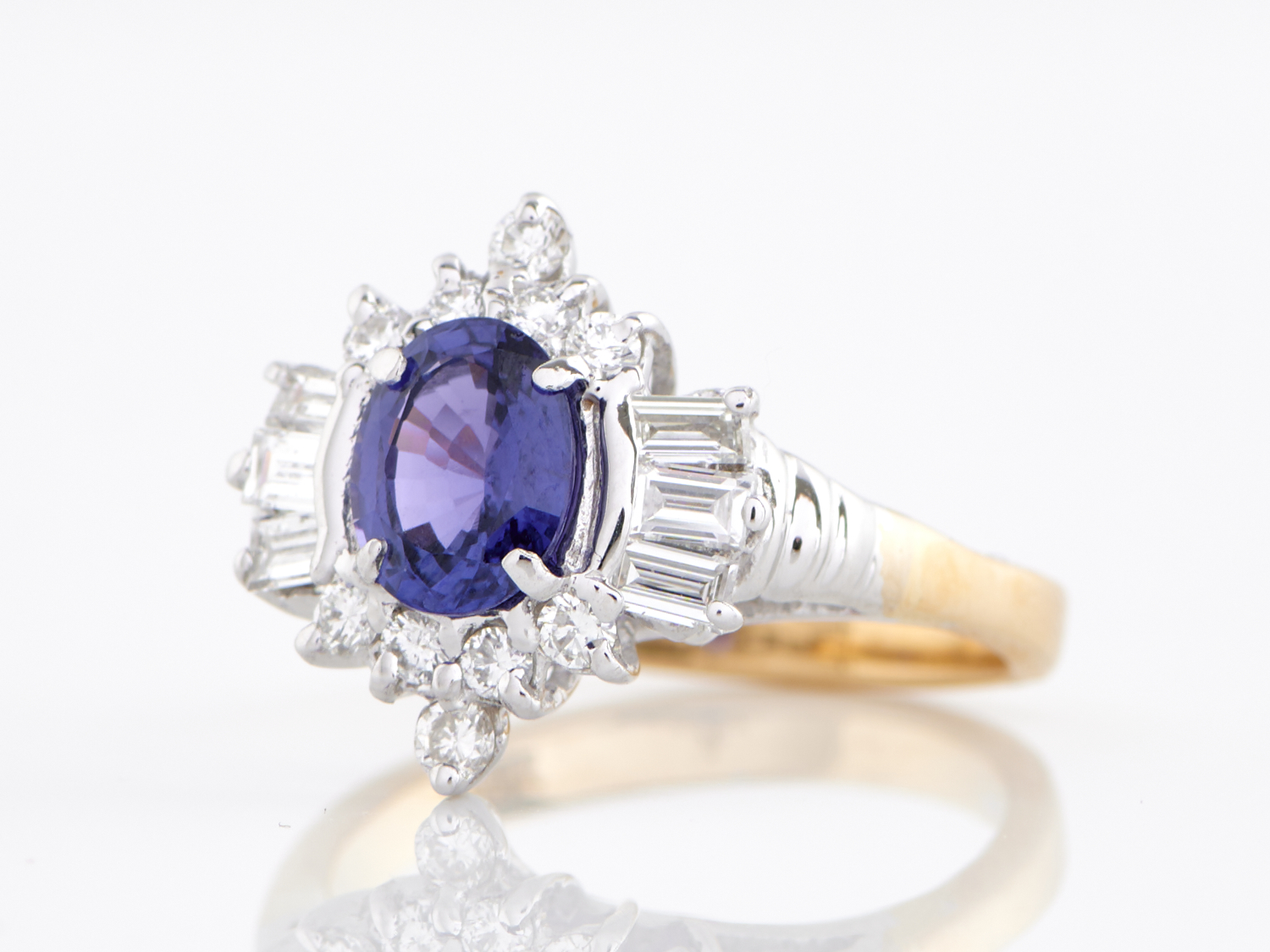 AN UNHEATED SAPPHIRE AND DIAMOND SET RING IN TWO TONE 18CT GOLD, THE SAPPHIRE OF 1.48CTS WITH DIAMONDS TOTALLING 0.55CTS, RING SIZE O, ACCOMPANIED BY CERTIFICATE AND VALUATION