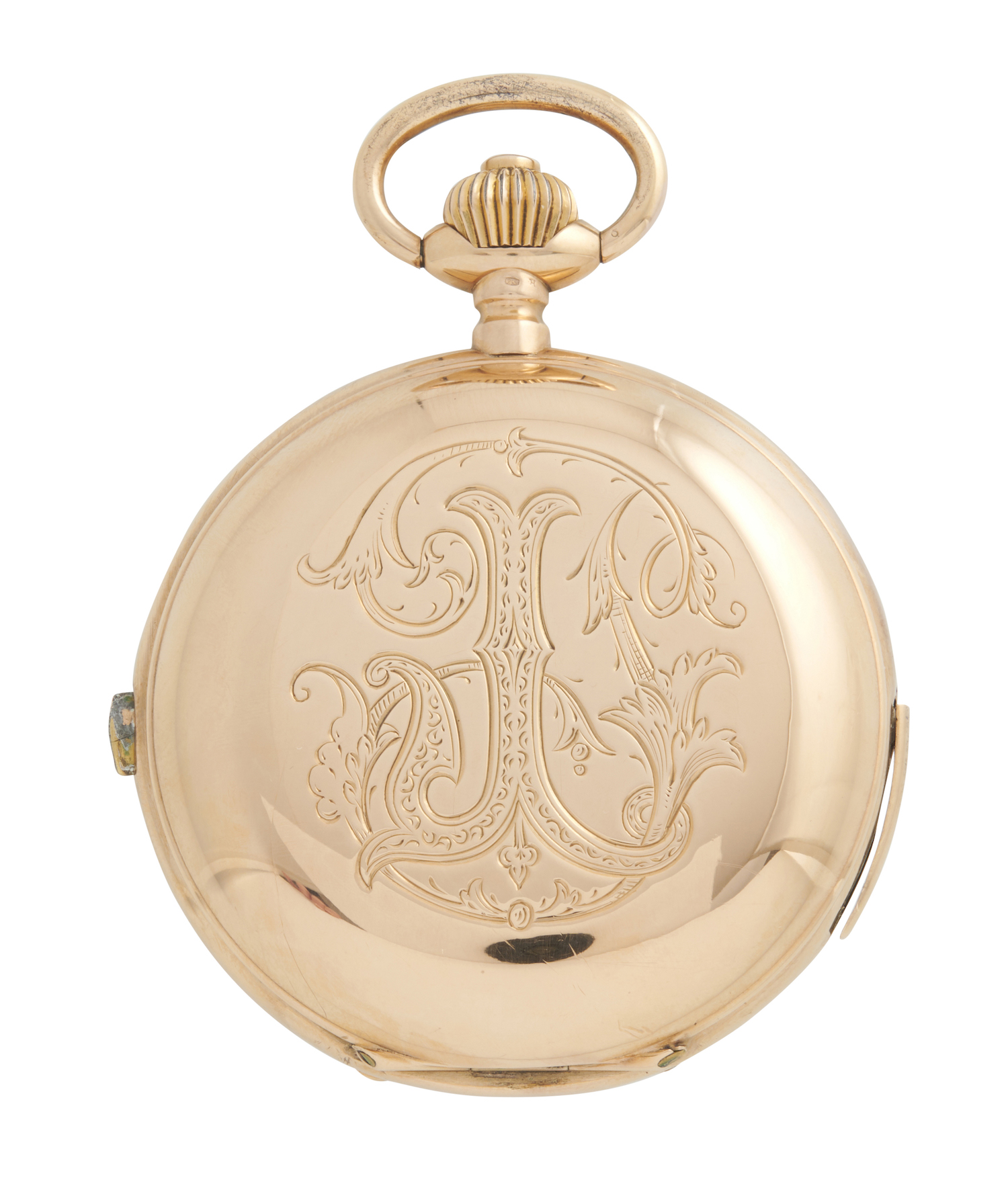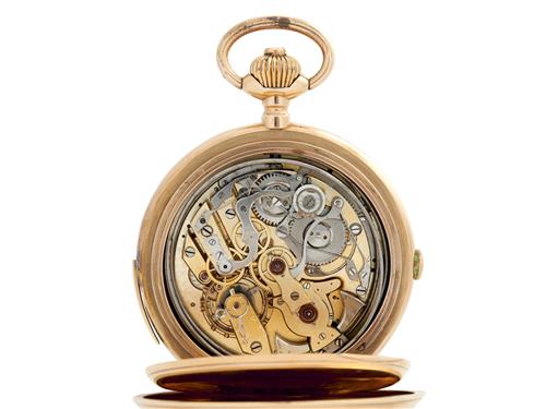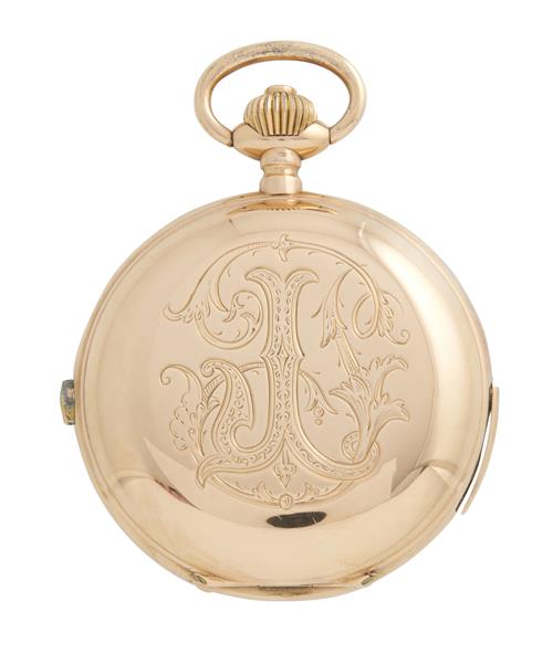 Case: polished hinged, monogram to front, inscribed gold cuvette, repeat slide at 7, chronograph button at 12, no.10214