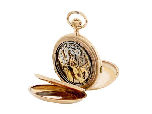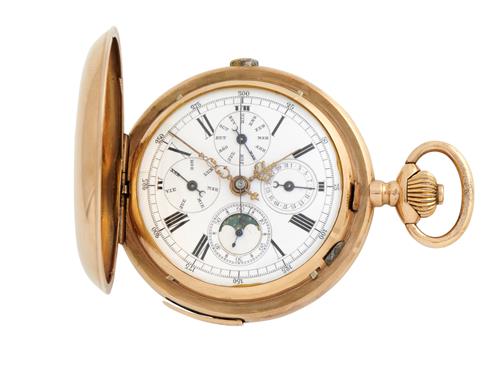 18CT GOLD QUARTER REPEATING HUNTINGCASED POCKETWATCH WITH TRIPLE CALENDAR MOONPHASE CIRCA 1900