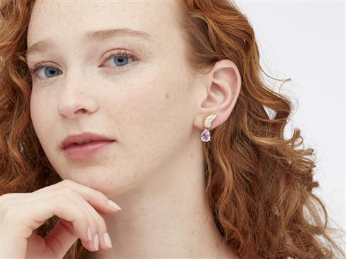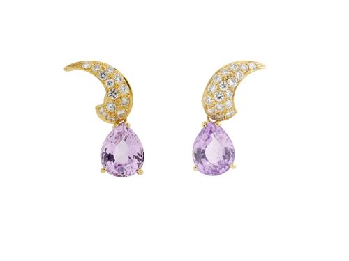 Each earring comprising a detachable claw-set pear-cut pink sapphire drop, suspended below a crescent shaped surmount detailed with pavé-set diamonds, the sapphires together weighing approximately 6.10 carats, the diamonds together weighing approximately 0.30 carats, to post and butterfly fittings, length approximately 25mm.