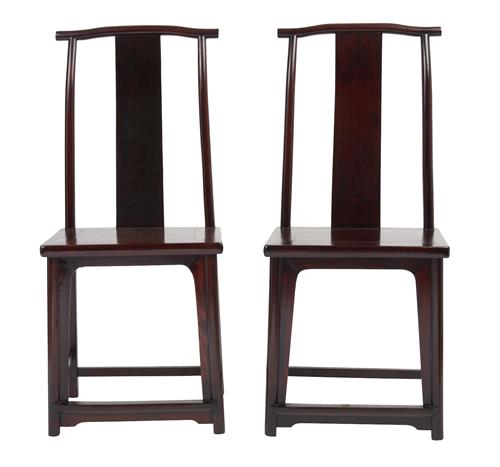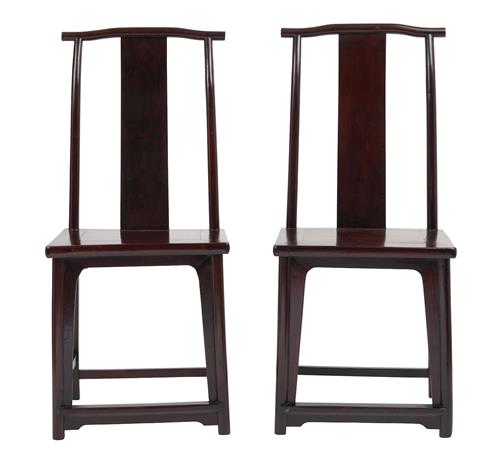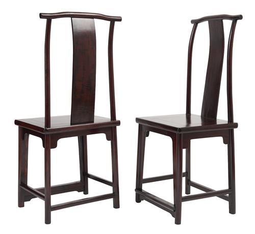 With yokeback top rails and s-curved back-splats, covered in a brown lacquer finish.