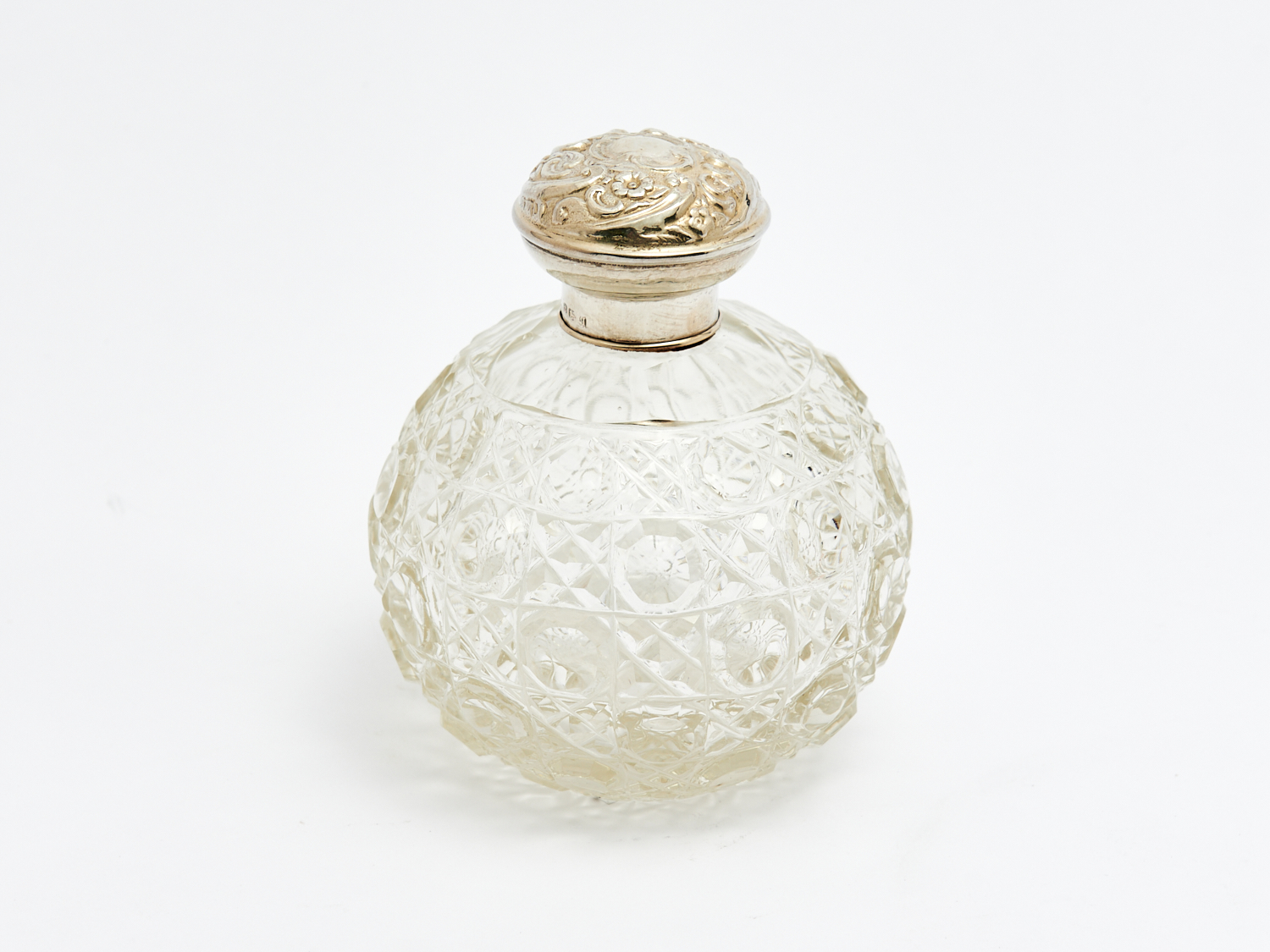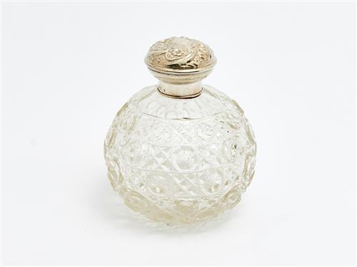 A STERLING SILVER LIDDED HOBNAIL CUT CRYSTAL PERFUME BOTTLE WITH ORIGINAL STOPPER H.11CM, LEONARD JOEL LOCAL DELIVERY: SMALL
