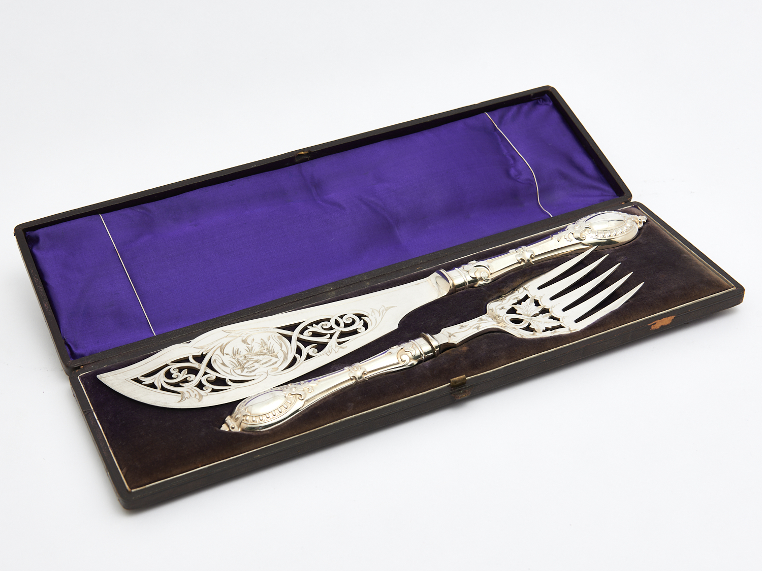 A PAIR OF BOXED 19TH CENTURY ENGLISH SILVER PLATE ENGRAVED FISH SERVERS L.36CM (LARGEST), LEONARD JOEL LOCAL DELIVERY: SMALL