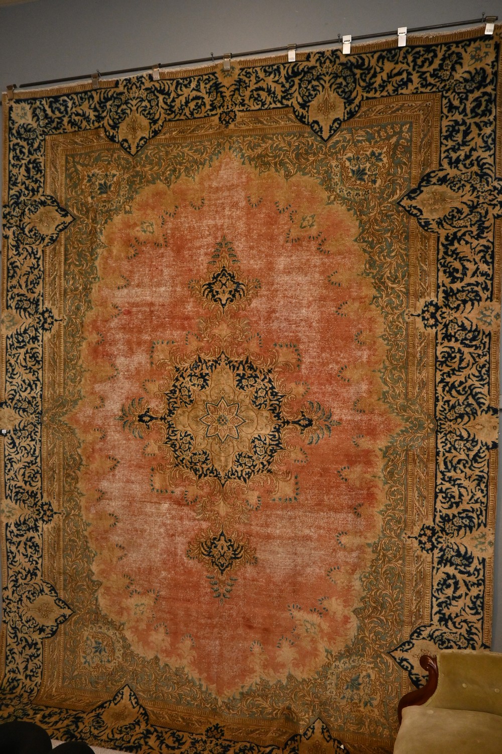 A CONTEMPORARY VINTAGE PERSIAN RAVAR KERMAN OVERDYED CARPET. AN AUTHENTIC FINELY HAND-KNOTTED VINTAGE PERSIAN KERMAN CARPET WITH AN ELEGANT DANCING FLOWER ANCHORED CENTRAL CHANDELIER MEDALLION ON A SOFT CORAL TONE FIELD. WITH ALL OVER TONES OF SAGE GREEN, CARAMEL, FRENCH, AND INDIGO BLUE. A UNIQUE BORDER OF DANCING BRANCHES IN GOLD TONES. SIZE: 348 X 247 CM. ORIGIN: PERSIA - RRP: $6,400. DOCUMENTATION OF AUTHENTICITY INCLUDED