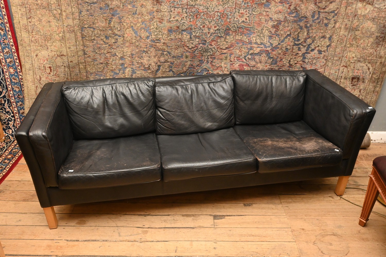 A DANISH THREE SEATER LEATHER SOFA (A/F) (71H X 202W X 76D CM) (PLEASE NOTE THIS HEAVY ITEM MUST BE REMOVED BY CARRIERS AT THE CUSTOMER'S EXPENSE. LEONARD JOEL STAFF CANNOT ASSIST CARRYING THIS ITEM) (X-LARGE ITEM)